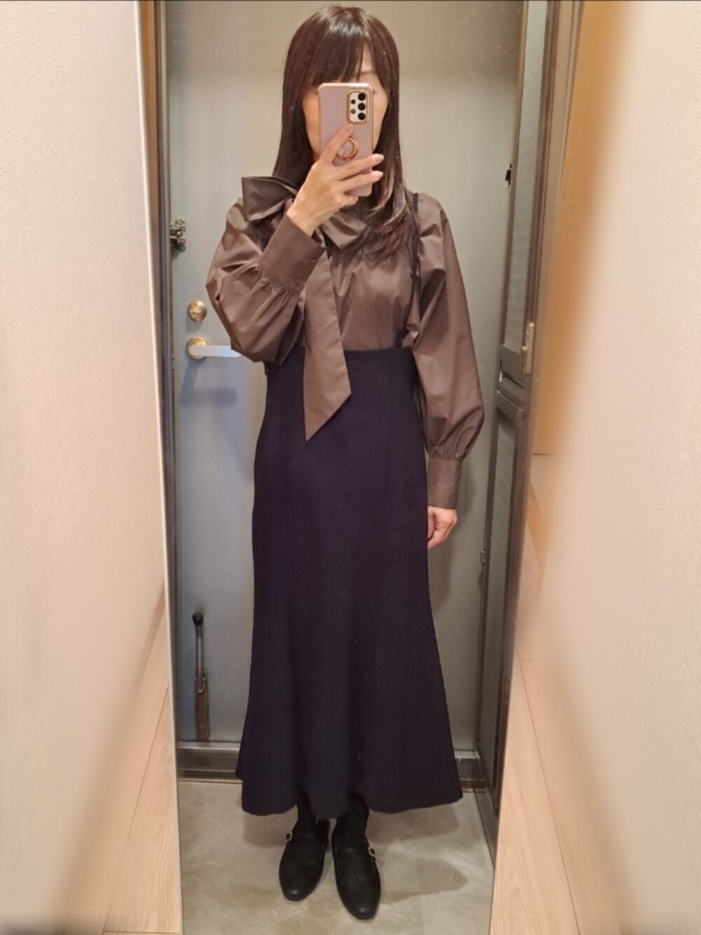 カーキのサイドボウタイブラウスとサスペンダースカートにシャギーカーディガン💨 外回りは黒ジャケに変えるとして... ソックス、白にすれば良かったかな💦 黒で同化しててソックス+パンプスに見えない💦 ☀時々☁ 予想最高気温 21度