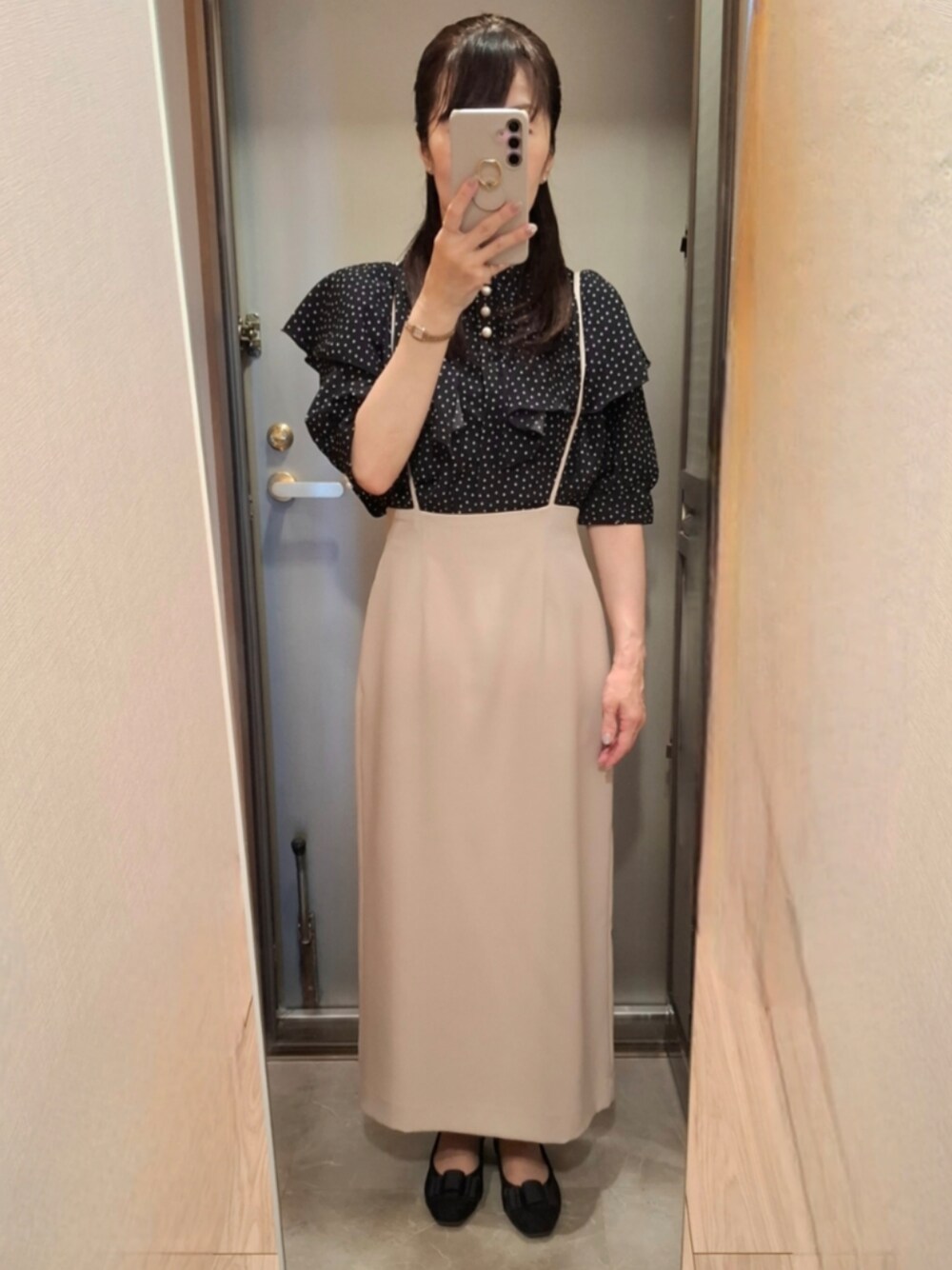 yukoのシャツ/ブラウス「【WEB限定】無地/変形ドットパール釦フリルブラウス」を使ったコーディネート