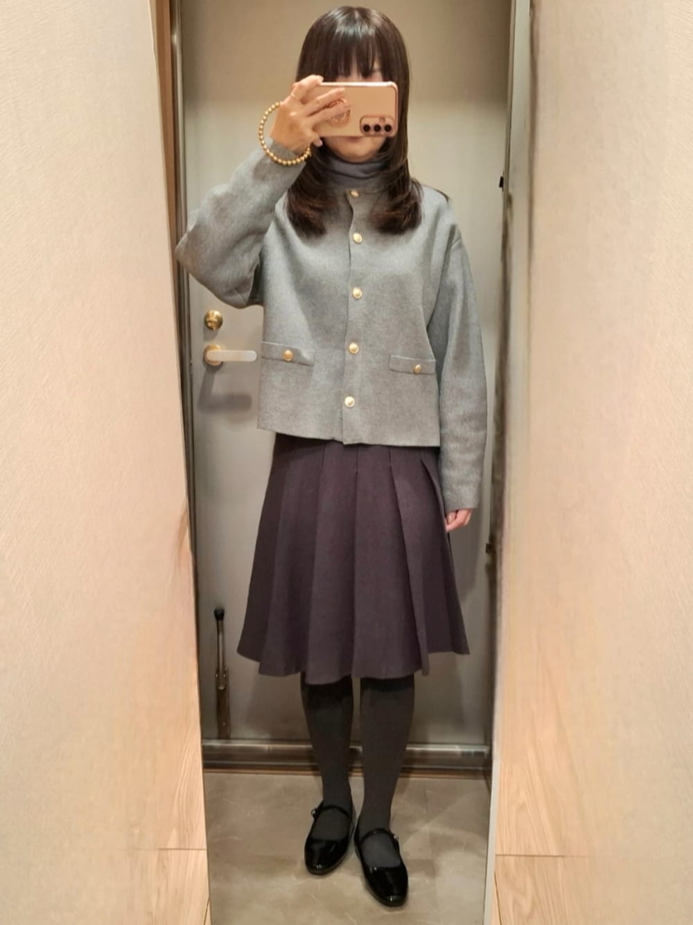 何年ぶり?5年以上ずっとロングスカートばかりできたのに、突然足を出したくなりまして(笑) ニットのひざ丈プリーツスカート、ガーリーにしたくてぺたんこのメリージェーンと👍 ☀時々☁ 予想最高気温 9度