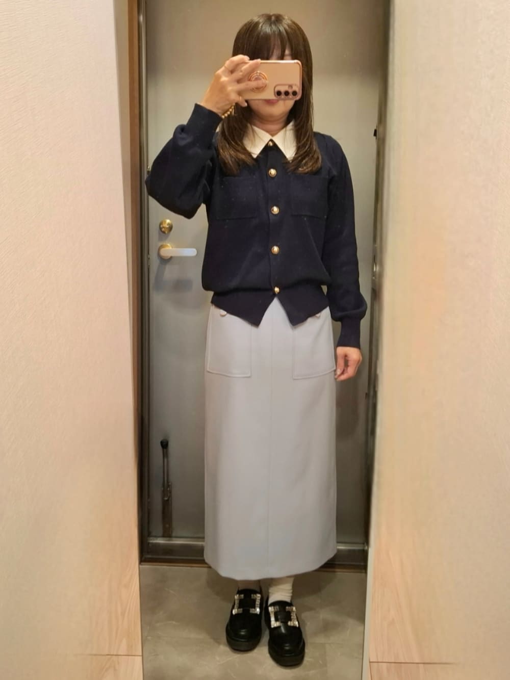 襟付きカーディガンとビジューローファーでトラッドな感じで… 今週は新任の挨拶に引継ぎ訪問が多いので憂鬱⤵️ 初めましては苦手です💦 ☔のち☀ 予想最高気温 17度