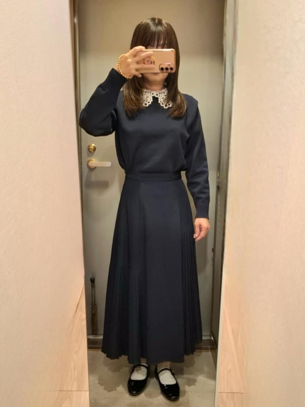 襟付きニットとサイドプリーツスカート、上下ともにネイビーでお行儀良い感じ💨 ☁のち☀ 予想最高気温 15度