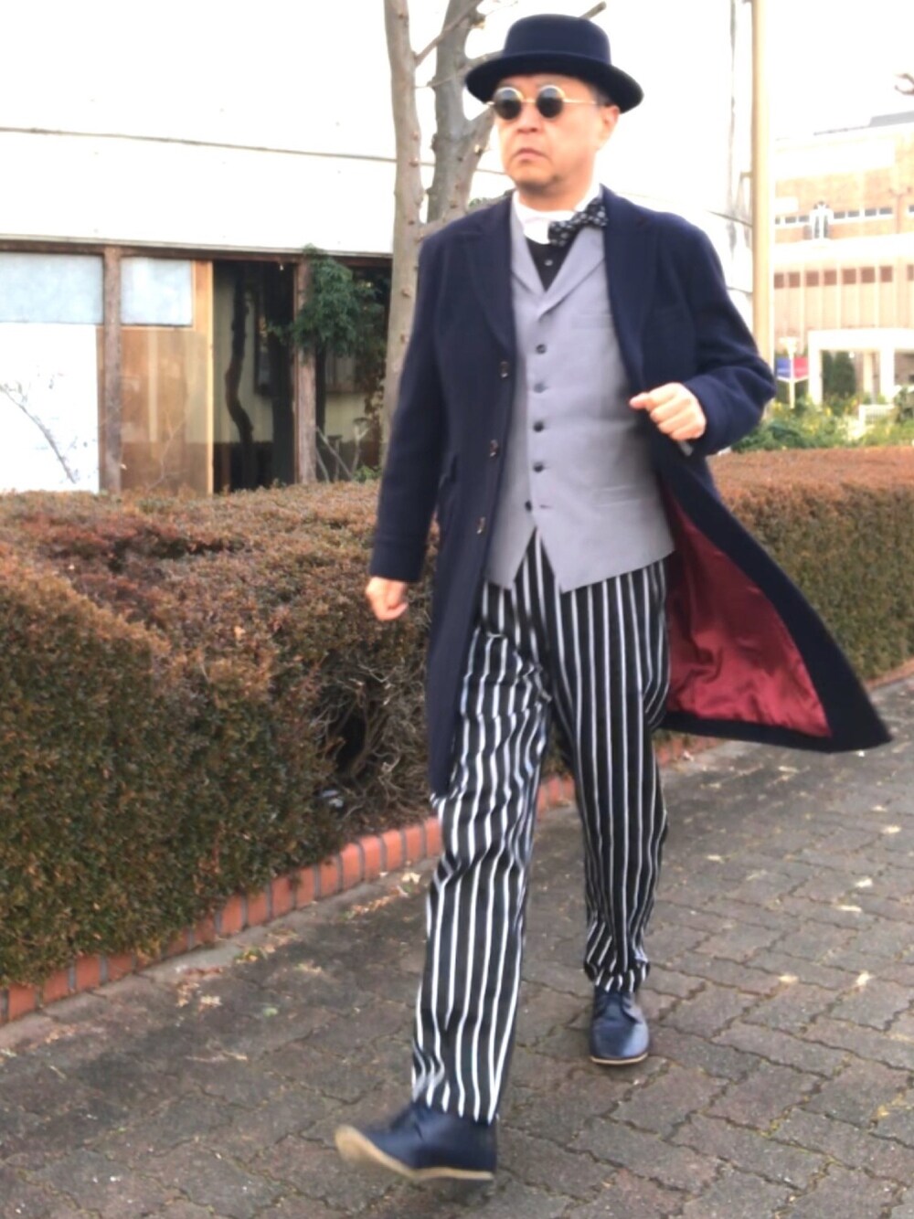 今日はズラしフェス参加コーデ。 基本フェス参加と言うのはどちらかと言えば嫌い。 まず基本馴れ合うのが好きじゃないし まるで意味の無いフェスも有って ああ言うのは特に苦手。 一つ赤いアイテムを入れるだとか クリスマスコーデ縛りとか そう言うのも嫌い。 ただ何故かスミちゃん経由で回ってくるヤツは 話を聞くと「ん?」と興味をそそられるものがたまにある。 例えば以前やった団鬼六フェスとか。 あれはなかなかいい企画だと思った。 大体凡庸な奴は凡庸な発想しか出来ない。 申し訳程度に何処か縛ってみたり 鞭持って写真撮ったり。 当然そんな格好で外に出るわけじゃない。 そんなのやるだけ無駄である。 やるならバッチリ縛って街に出なければ意味ない。 俺?当然身体を縛って外に出ましたともw どうせ参加するならそれくらいやらなくちゃ意味が無い。 今回もそう。 最初メガネをズラすとかパンツの裾を片方だけロールアップみたいに考えたが そのくらいは他でやるだろう。 俺がやるなら他の誰とも被らない方法で 尚且つ自分のスタイルを踏襲した形でなければならない。 おしゃれかどうかが自分の中では結構重要。 普通のトラッドみたいに見えるがよく見ると襟と蝶タイが曲がってる。 そんなシャツを持ってるのかなと思われるかもしれないけど実はそうではない。 これはネタあかしすると一見クレリックシャツに見えるが 元々黒のバンドカラーシャツに ラウンドカラーの白い付け襟をしてる。 そして蝶タイと襟をズラしているという事。 元々旅行によく行くので荷物を減らす必要に迫られて考えた技なのだ。 旅コーデは制限も多くて妥協しなければいけないところもあるか 知恵を使う事の大切さを教えてくれる。 今年はGWに嫁の実家(黒竜江省 牡丹江市)に帰るつもりだが この時が大きな旅コーデの実験の場になるだろう。 ちょっと話がズレた(ズラしフェスだけにw) 一応コーデの詳細を。 帽子…ポークパイハット紺 シャツ…黒バンドカラーシャツ+付け襟、黒柄入り蝶タイ ウエストコート…襟付き(バーテンダー用ワークウェア) コート…ニットのポロコート パンツ…厨房用ワークウェア 靴…ダンスシューズ紺 パンツのせいか少しだけフロックコートやディレクターズスーツみたいに見える。 ちょっとだけフォーマルな感じ。 ではまた^_^y〜