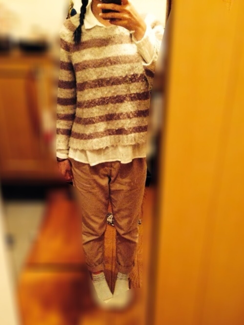 茶色ボーダーニット。しちぶ丈だから白のブラウスがちらり