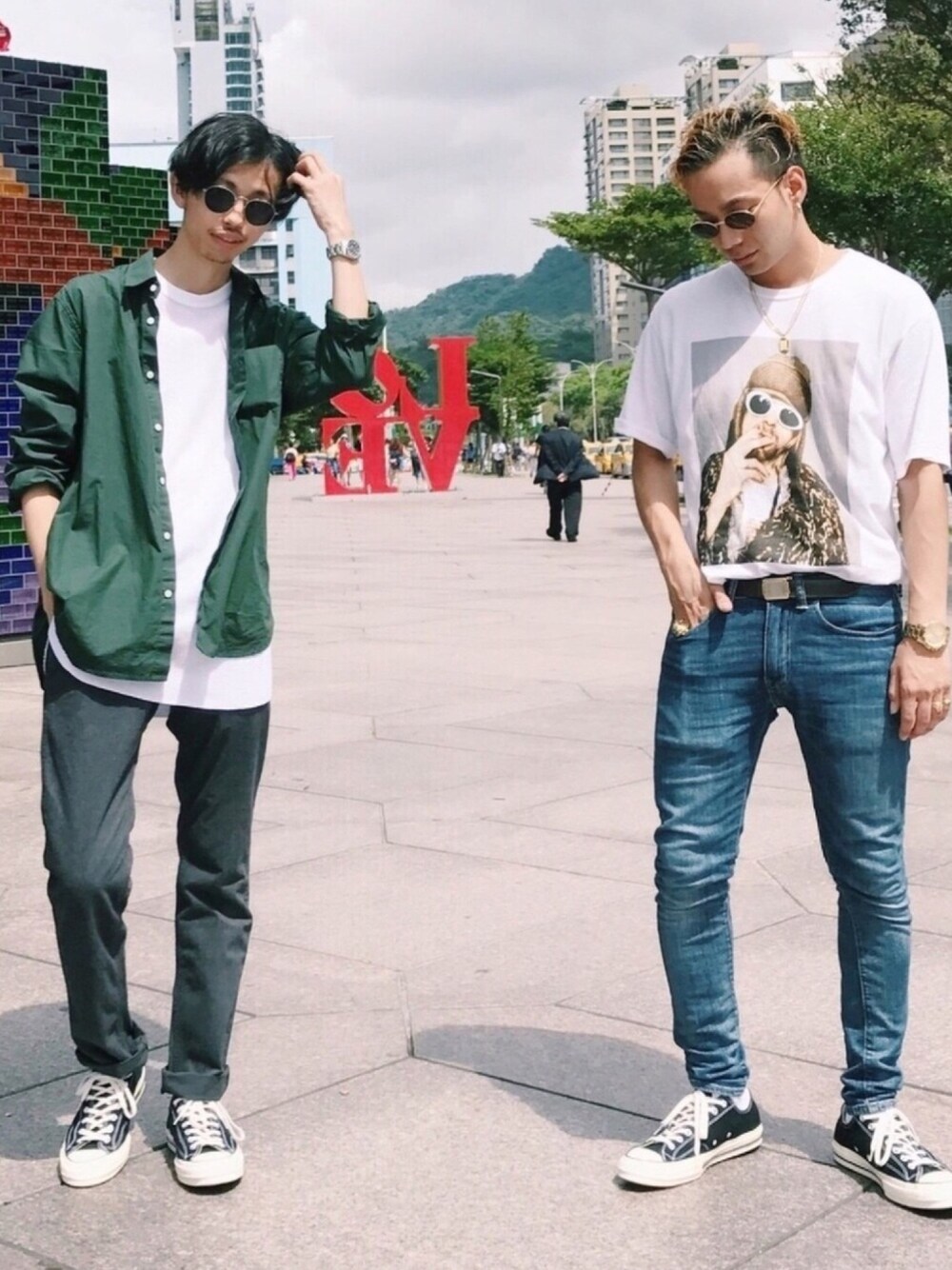 いつもご覧頂きありがとうございます😊 ✨コラボコーデ✨ SEVENDAYS=SUNDAY仲間の 🐅hiGucci🐅さんと 台湾にてパシャり📸 ヒグチさん内面も外見も超イケてます⭐️ ファッションも趣味も見習うところばっかり! 🐅hiGucci🐅さんのアカウントでは 別バージョンのコラボコーデを公開してもらってますので まだ見てない方は是非‼️ そしてお気づきでしょうか、、、 スニーカー👟リンク!!! 日本では中々手に入らない、、、 あったとしても高額な、、、 👟コンバースのCT70👟 台湾では日本の半額くらいで手に入っちゃうんで即買いでしたね(笑) 日本で手に入るALLSTARとは はき心地と なにより優越感が違います(笑) 台湾へ行かれる際には買うべき一足かもしれません。 ではでは!!