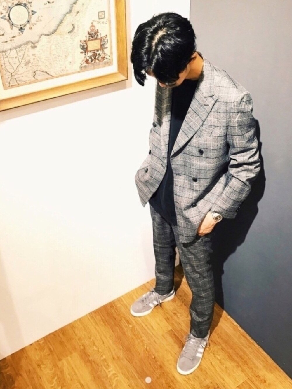 いつもご覧いただきありがとうございます😊 ✨セットアップスタイル✨ ダブルのジャケット しかもピークドラペル なのに 黒Tで合わせちゃうし スニーカーも履いちゃう みたいな😉 カジュアルダウンにハマっています。 あ、これドローンで撮影したわけではないですよー(笑) 上からのアングルって新鮮😲