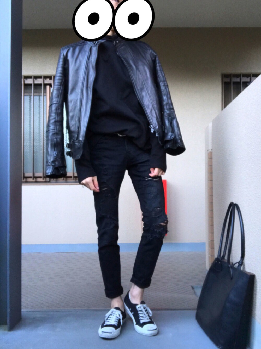 前の投稿にライダースを羽織っただけのものです オールブラックコーデ😂ライダースで重さが出すぎてしまうので靴に黒ベースでソールが白の物を選び余裕を持たせました😂