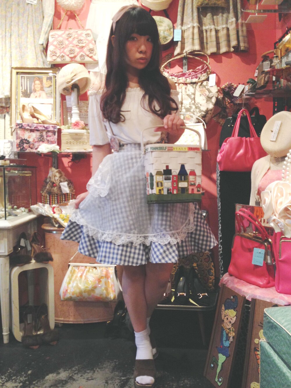 ・オフショルダークロップトトップス ・サスペンダー ・ギンガムチェックフレアスカート ・VINTAGE レース付シースルーエプロン ・VINTAGE Caro-nan Box Bag ・木底レザーサンダル 晴れた日にピクニックに行きたくなるような。。春らしいコーデです♪