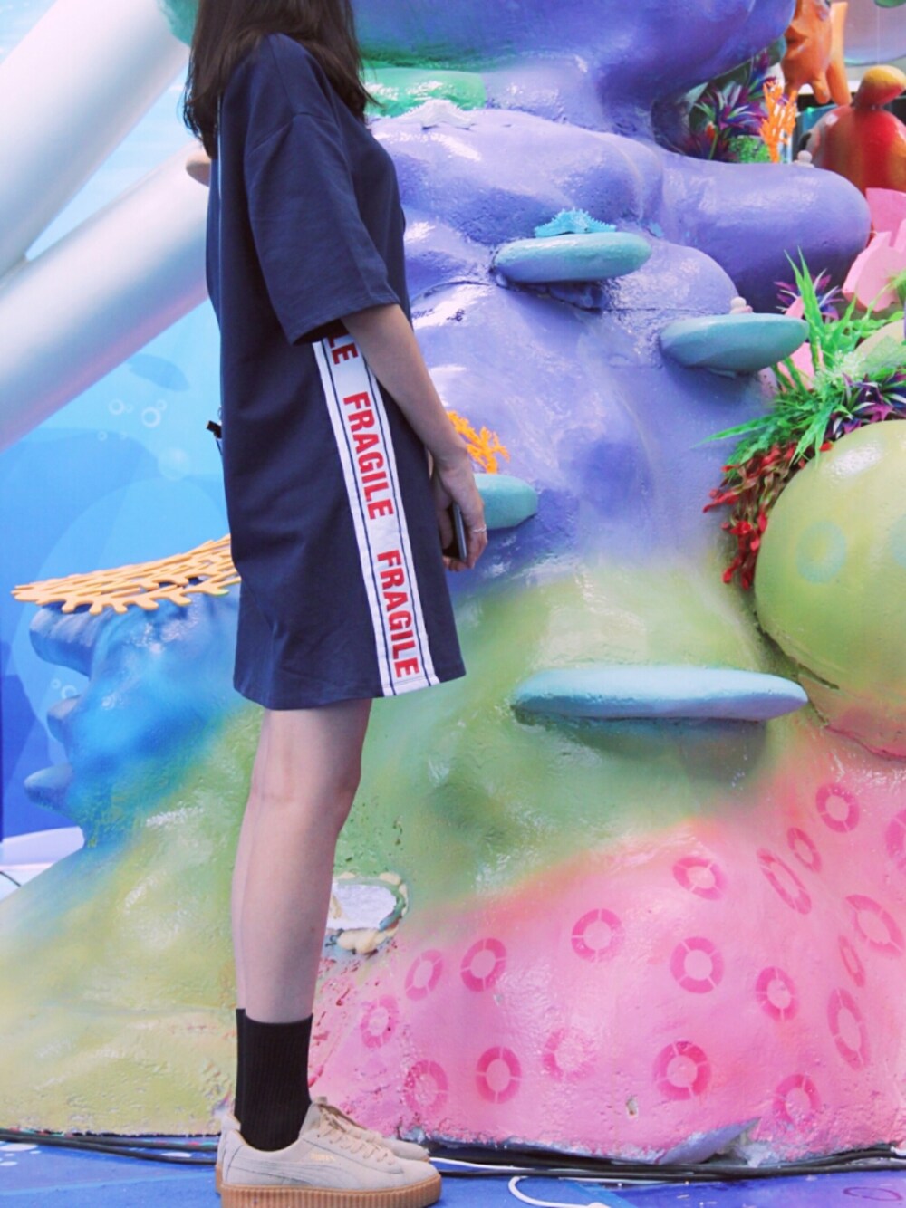 一条纯色的连衣裙其实也没有很特别 但是这一边的一条字母贴布很特别 ✨puma的鞋子好久没穿了 这样配上也非常好看呢😌