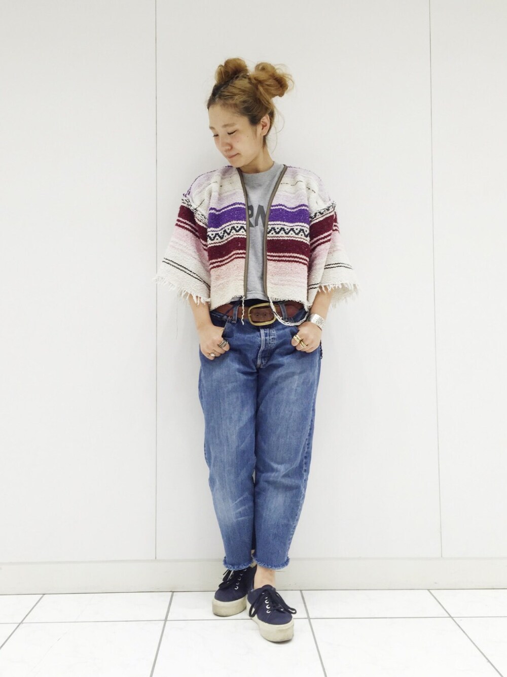 配色にひとめぼれのメキシカンラグのジャケットは身幅が広いのでミッキーおだんごでバランスをとったよ😇 古着屋さんでゲットした501は裾をちまちまひっぱってフリンジにしました〜👼👼