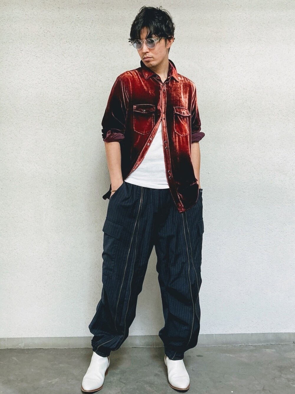 ウエスタンシャツ、カーゴパンツ、ブーツというアメカジアイテムを艶やかな素材で大人っぽくしました。 シャツのボタンを上の方だけ止めて下が広がるようにパンツのラインに繋げてAラインを強調。 黒を使わずトリコロールカラーでまとめました。