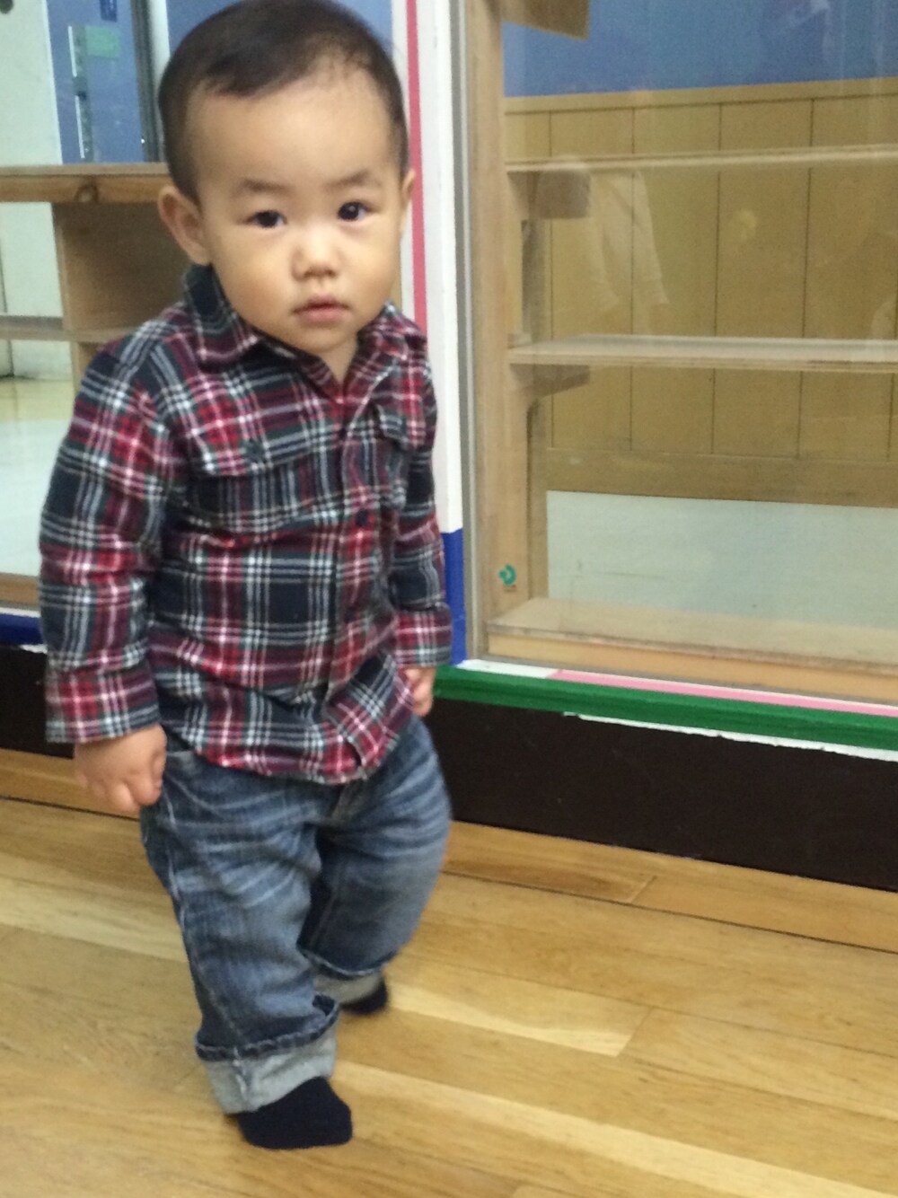 クリスマスなので赤と緑のシャツで。 寒いのでデニムの中にスパッツ履いて、外ではユニクロのエアテックのジャンパー。