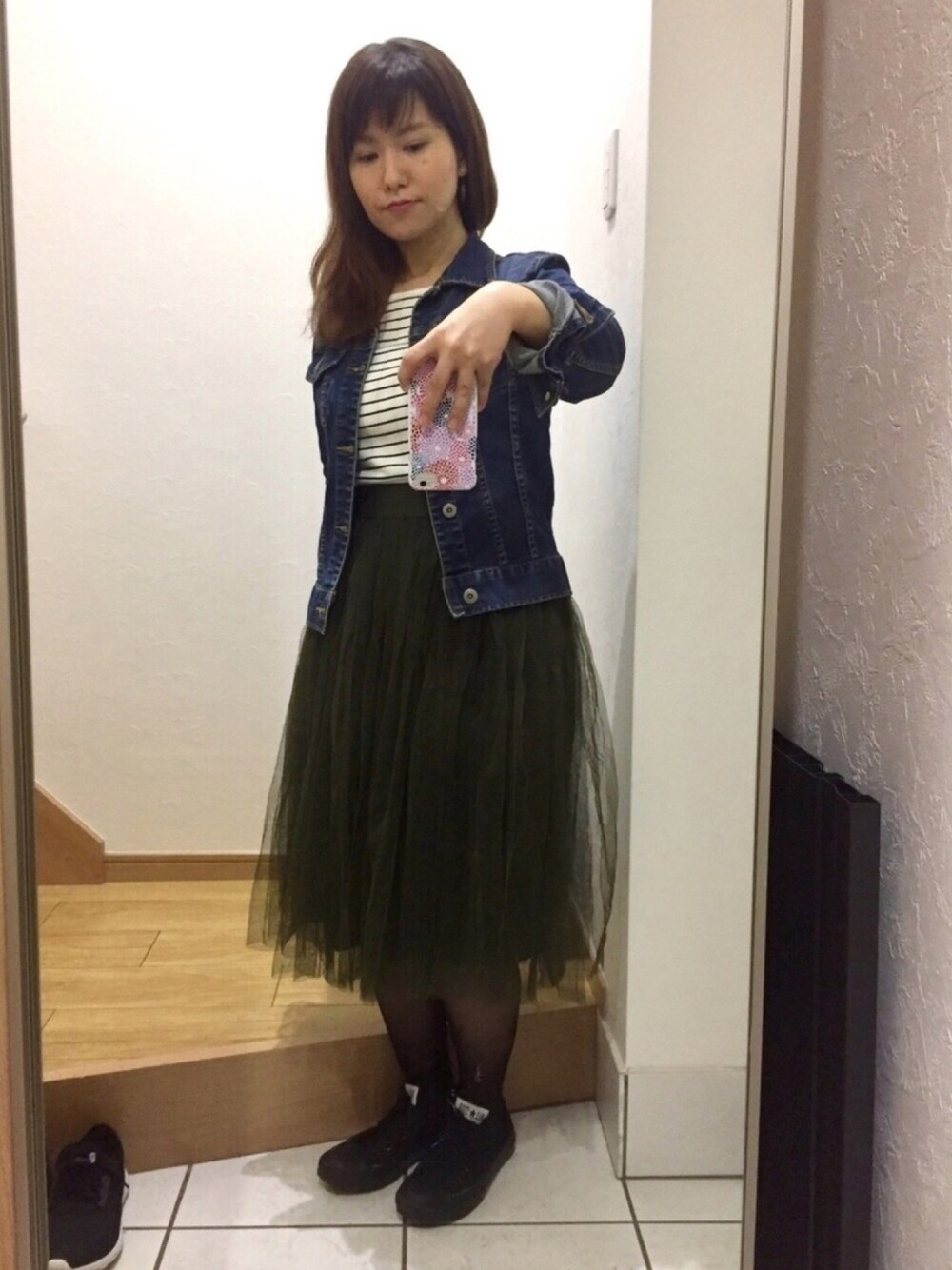 チュールスカート、初めて買いました。ここのはお安いし、モワッとせずに良いシルエットです。 色違いのライトグレーのロングスカートもシルエットは良さげです。長さは裏地はギリギリ膝が隠れるくらい、チュールは膝下という感じ。 デニムジャケットは数年前にgreen label relaxingで買ったもので、サイズは38です。 ボーダーのリブニットトップスもシルエットきれいめで、よきです。