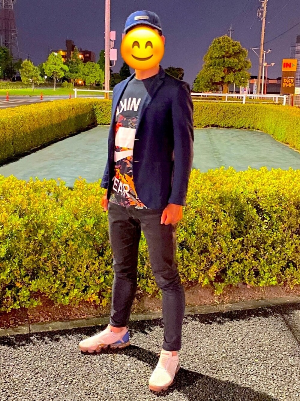 「シュプ+NIKE」 カジュアルなTシャツにシックなジャケットを合わせ、足元は派手に👟