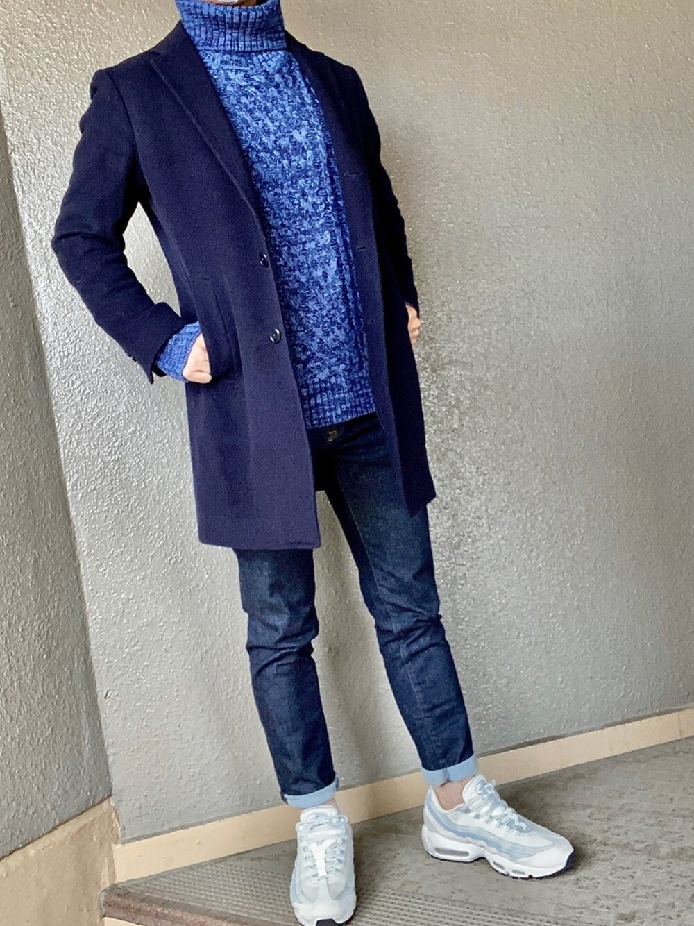 タートルネックとカシミアチェスターコートでキレイめ演出 シンプルですが、かっこいいですね。