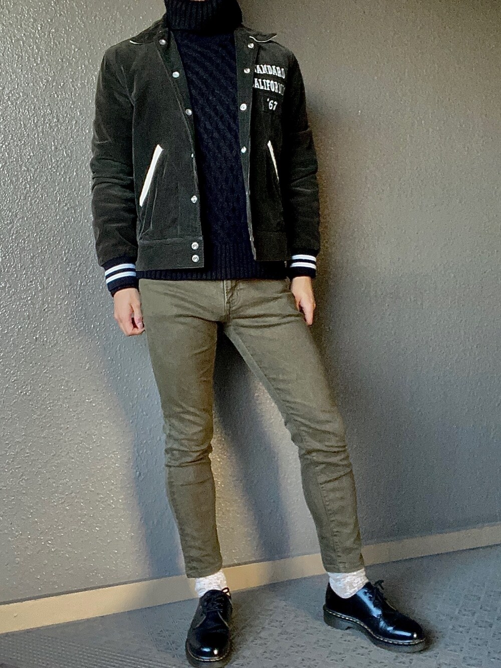 スタンダードカリフォルニアのライダーズジャケットは羽織るだけで締まります! 緑コーデですが上手くまとめられました😉