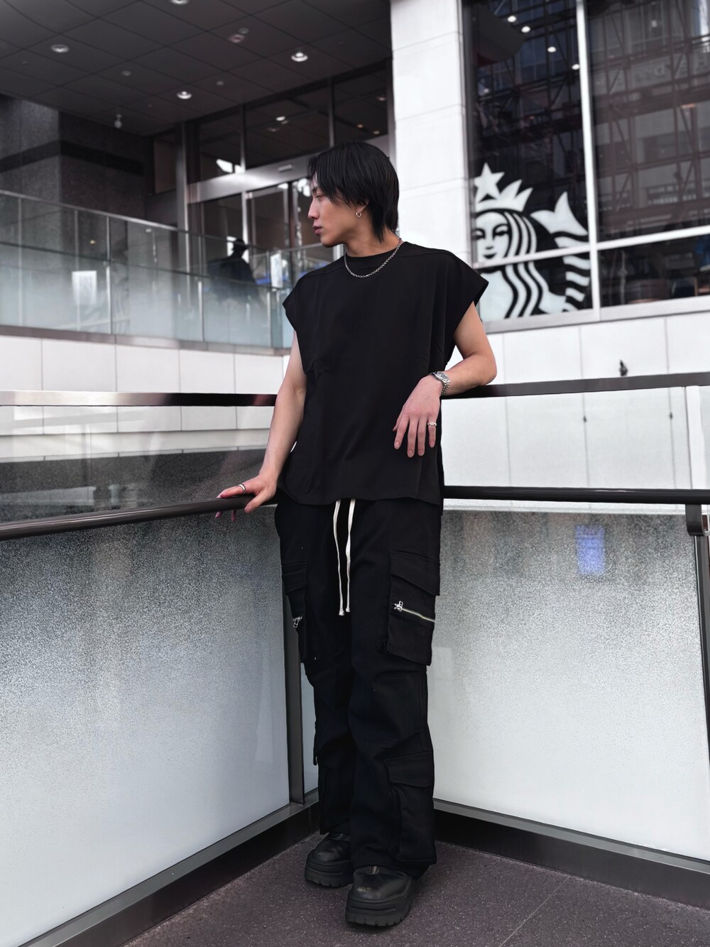 shizuma(THE GALLERY BOX SENDAI)のカーゴパンツ「ANDRAP/アンドラップ/WIDE FLARE CARGOPANTS/ワイドフレアカーゴパンツ」を使ったコーディネート