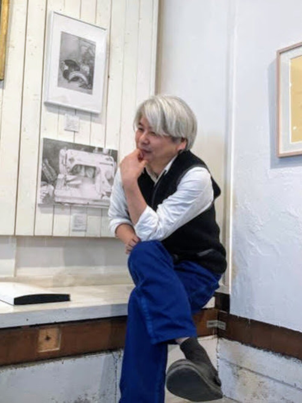 経営するギャラリーでの撮影なので靴は脱いだり履いたりが楽なクロックス。 417byEDIFICEの白シャツに45rのウールベスト。 パンツはゆったりめ。 オジさんが「若作り」と言われない程度に明るく見えるよう考えてコーディネート。