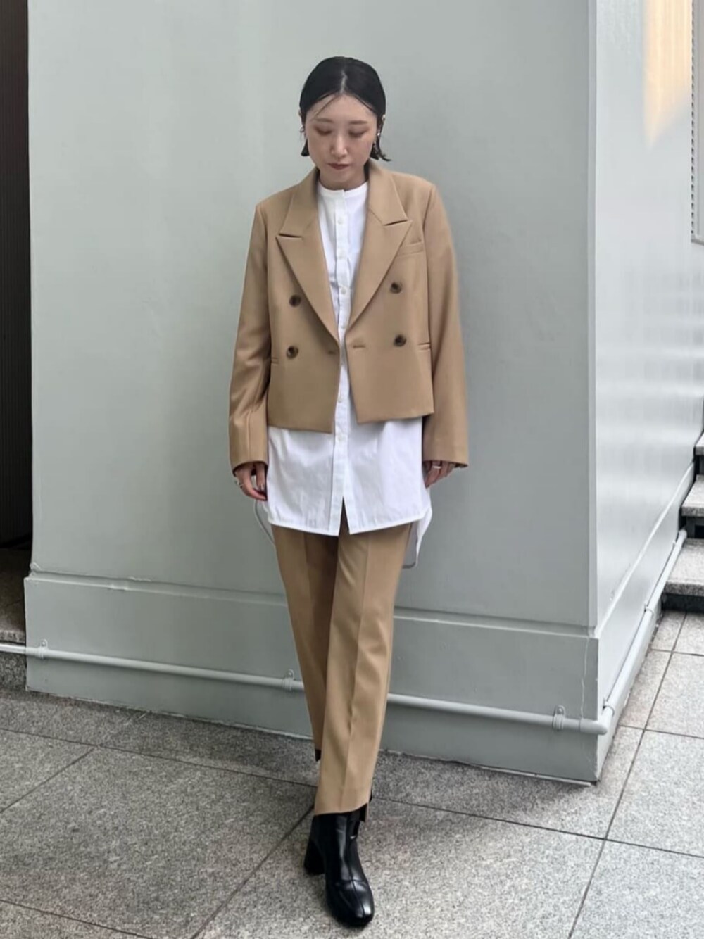 【サイズ感】 アウター:標準 トップス:ゆったり ボトムス:標準 【着用レビュー】 今年らしいクロップドジャケット。 ハリがありまっすぐなシルエットでシャープな印象に。 シャツはニットとのセットなので、買った日から合わせるのに困りません。 パンツはほっそり見える美シルエット。 ふくらみのあるツイル生地で、つっぱり感はあまり気にならなかったです。