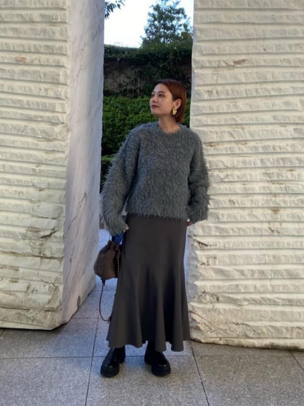 【サイズ感】 トップス:ゆったり スカート:標準 【着用レビュー】 ニットは長めの毛足が目を引き、コーデの主役になってくれます。 程よいコンパクトな丈感で全身のバランス◎。 チクチクもなく着心地が良いです。 スカートはさらっとした素材感で秋冬のコーデに軽さをプラスしてくれます。 シルエットが綺麗なので、トップス次第でオフィスでもプライベートでもお使いいただけます。