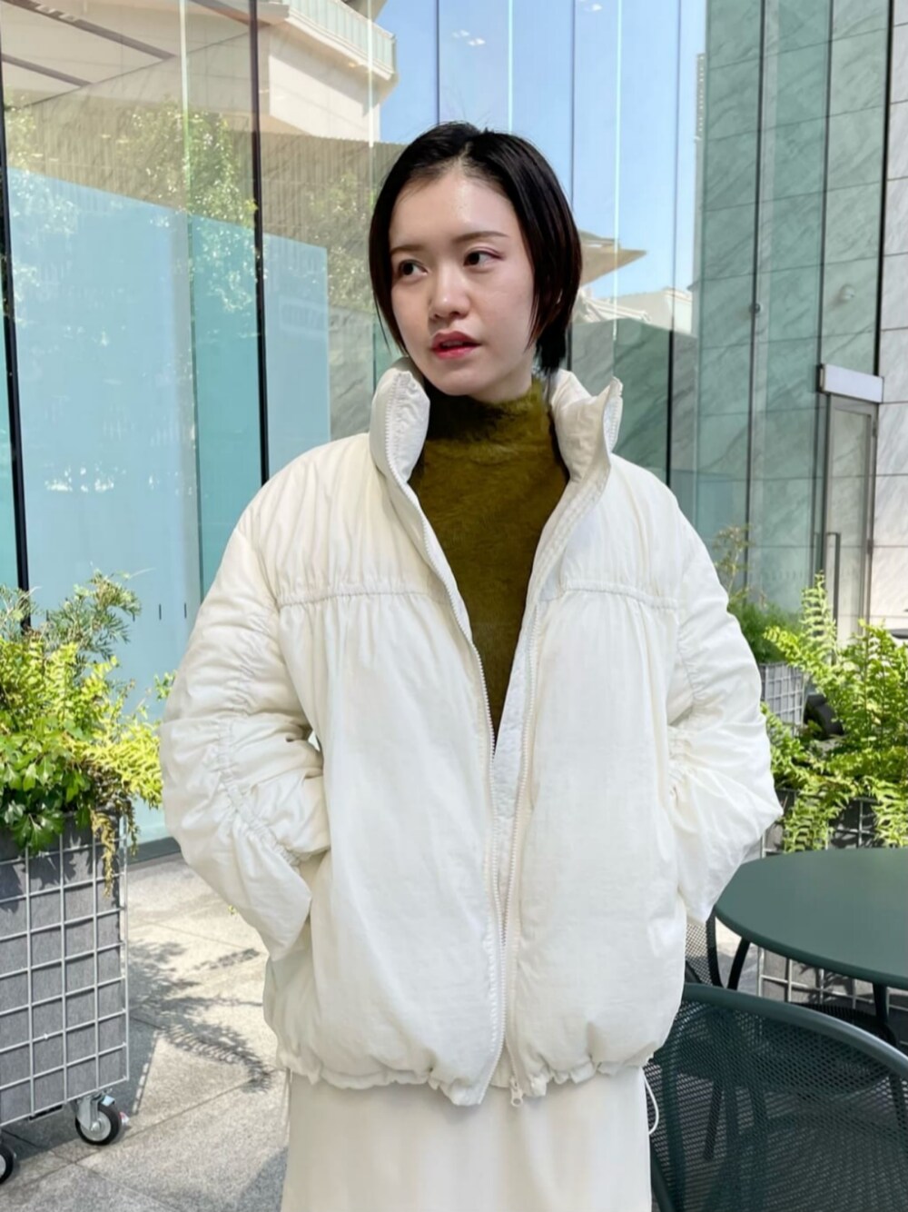 [サイズ感] アウター:ややゆったり トップス:やや細身 ボトムス:標準 [コーディネート] ギャザーたっぷりのキレイめカジュアルなダウンコート。袖口リブで、手首からの冷気もしっかりシャットアウト。 インナーは高い伸縮性で、程よいフィット感がクセになる着心地です。
