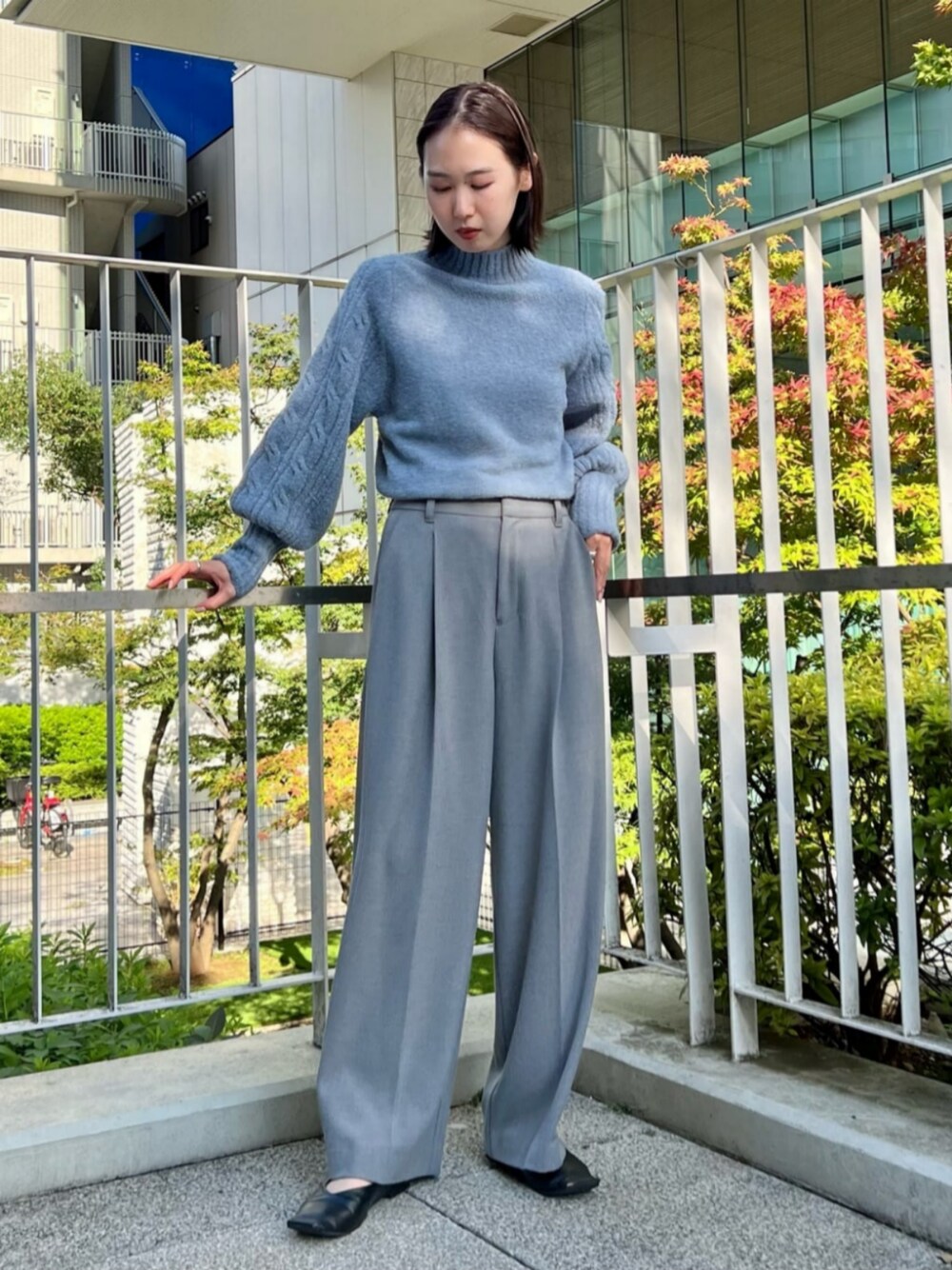 <サイズ感> トップス:標準 パンツ:標準 袖のケーブルデザインがポイントのニット。 ボリュームある袖なので1枚でも可愛く着ていただけます◎ パンツは今回38サイズ着用しましたが、ウエストに余裕がありました。 丈はヒールなしでギリギリつかない程度です。