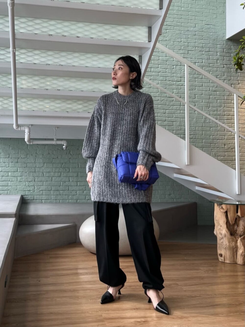 【サイズ感】 トップス:ゆったり ボトムス:標準 【着用レビュー】 ニットはざっくりたっぷりしたボリュームのある素材。 柔らかいので前だけインするスタイルも楽しめます。 ラメ糸が煌めくオシャレニットです♪