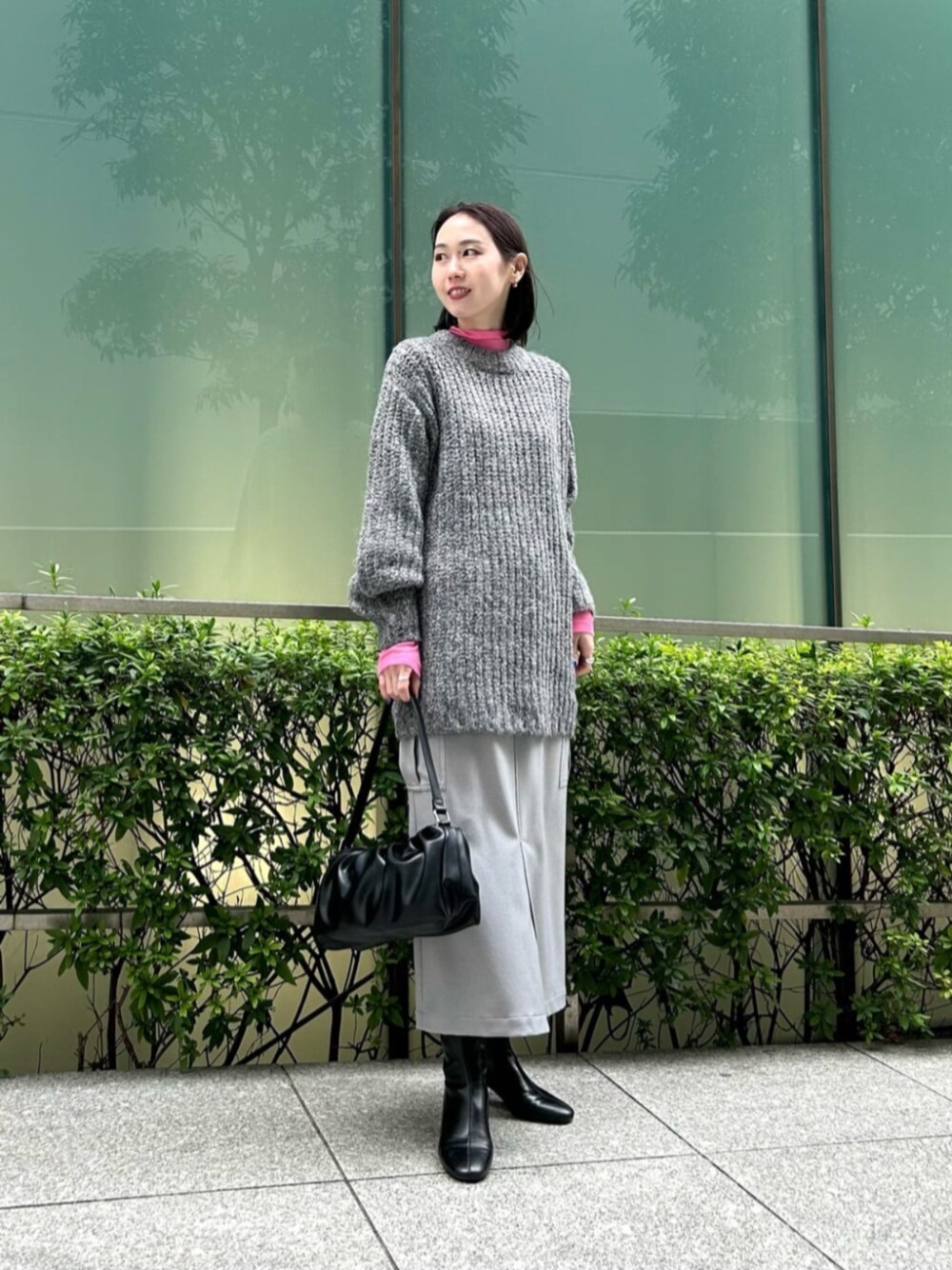 <サイズ感> インナーのニット:細身 ニット:ゆったりめ スカート:標準 ピンクを差し色にグレーワントーンのコーディネートです。 お尻がすっぽり隠れるニットはあえてインせず、ずるっと感が◎ ラメ入りで冬っぽく綺麗です。 スカートはウエストゴムで楽に履けました。