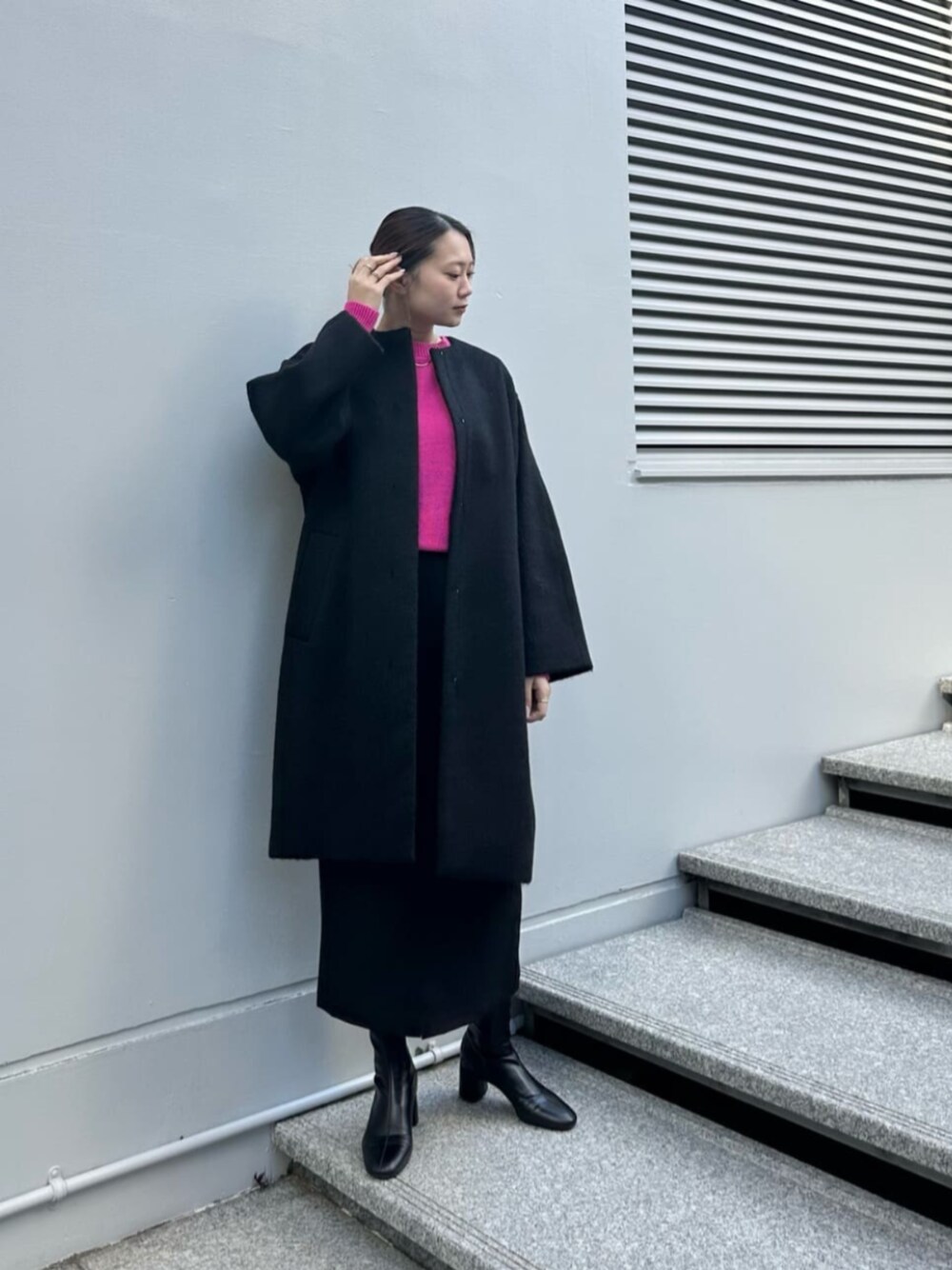 【サイズ感】 コート:ゆったり ニット:ゆったり スカート:標準サイズ(ウエスト総ゴム) 【着用レビュー】 ピンクニットが主役なコーディネート! コート、スカート、ブーツは黒でまとめました◎ パキッとしたピンクは、ベーシックカラーとの相性◎です! ドルマンスリーブですが、袖口のリブを少し長めに作っているので華奢見えします