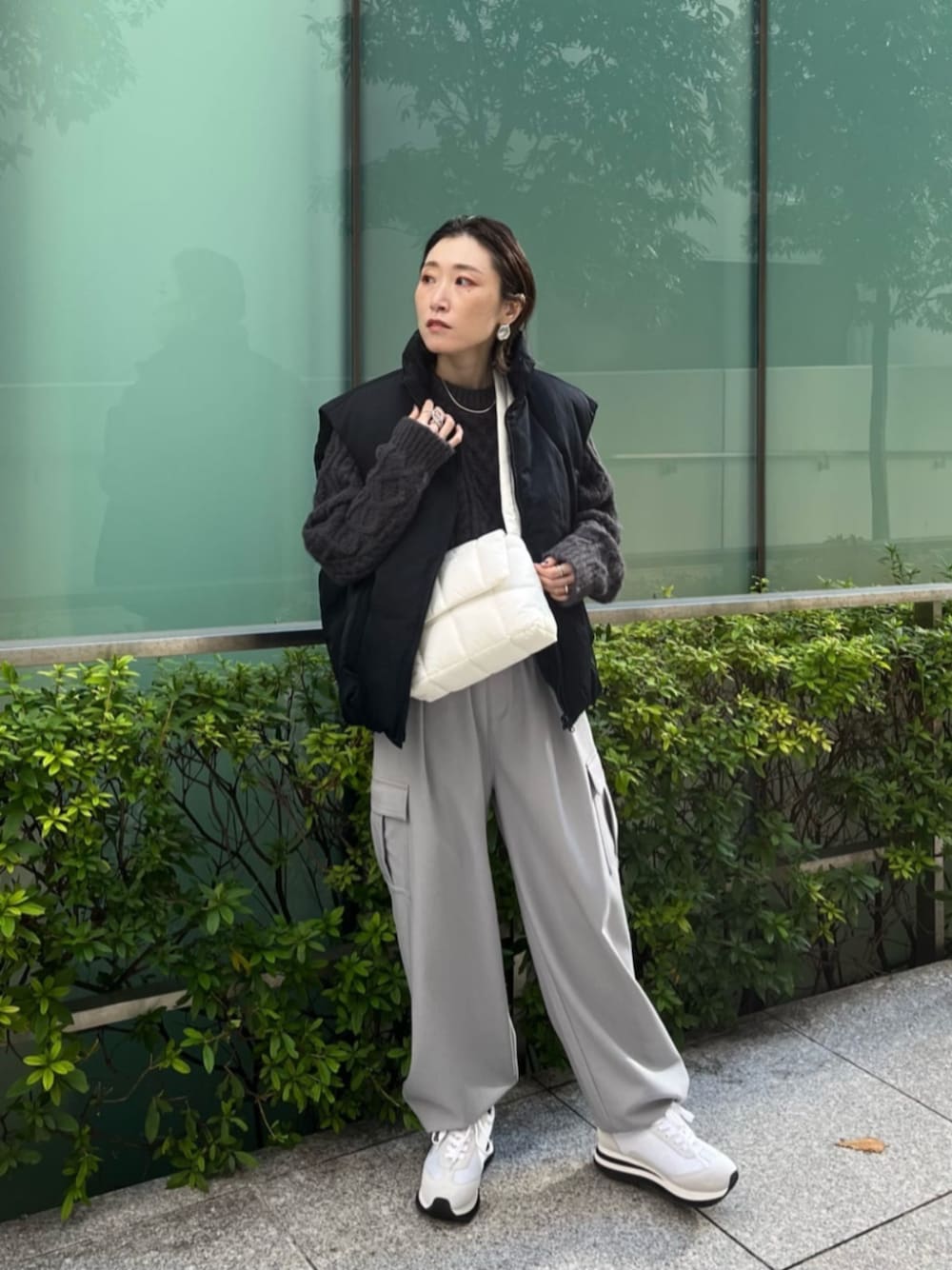 【サイズ感】 アウター:ゆったり トップス:標準 ボトムス:標準 【着用レビュー】 中綿ベストを使った休日モノトーンコーデ! ボリュームのあるベストなので、バッグは短めに中で斜めがけにしたのがすっきり見えるポイントです♪ パンツはゆるめに38着用してます☆ 少しだけ起毛感があり、なめらかな着心地で穿きやすいですよ!
