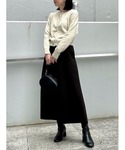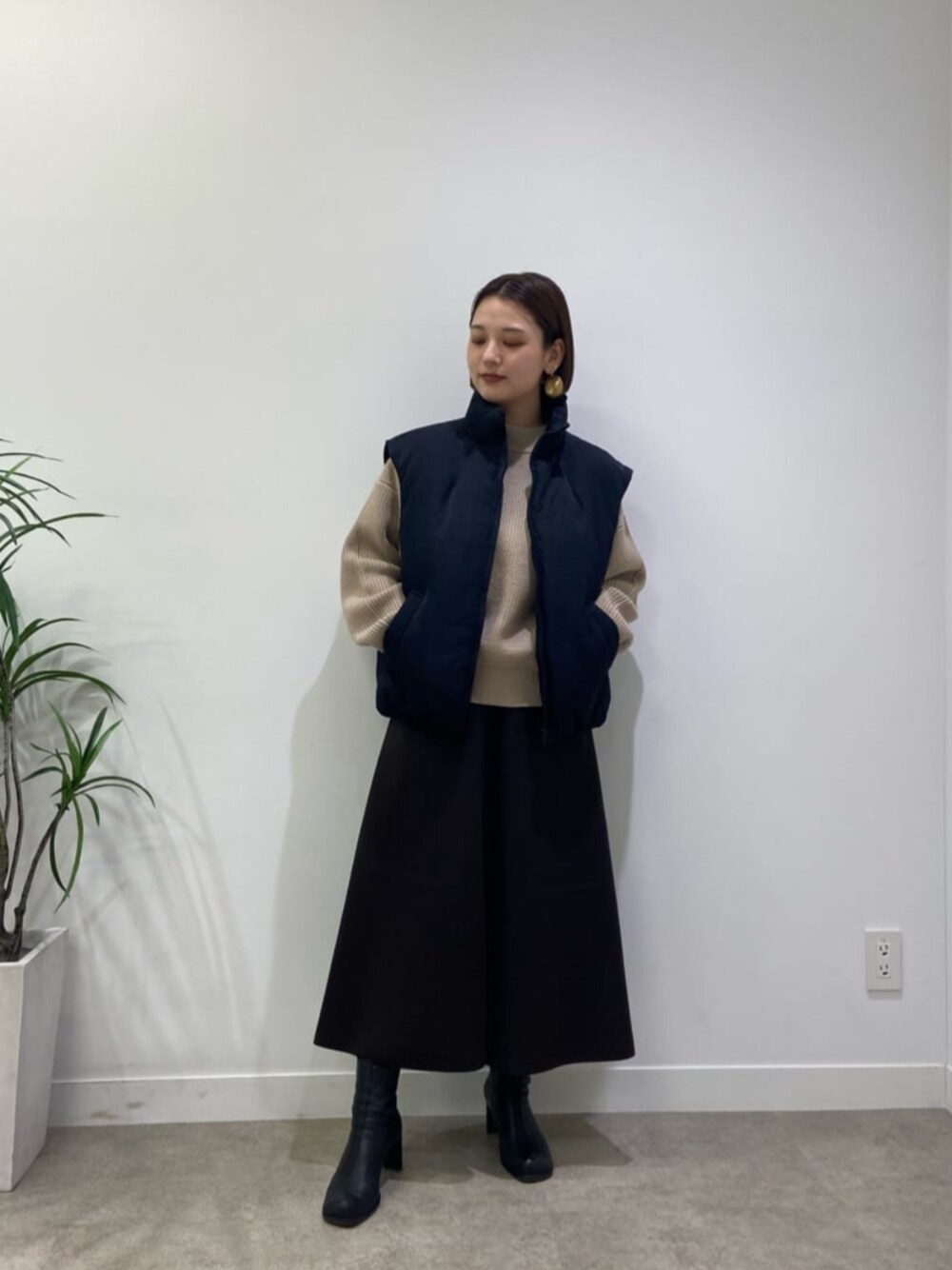 【サイズ感】 ベスト:ゆったり ニット:ゆったり スカート:標準 【着用レビュー】 ベストは中綿たっぷりで防寒性◎。 ニットやウールコートに重ねるとあたたかく、 おしゃれ感もしっかり出せます。 トップスはざっくりと編まれた立体感がかわいいニット。デザイン自体はシンプルなので、どんなボトムスとも合わせやすく、着回し力の高いアイテムです。 スカートはメルトン素材であたたかいです。 上品なタイトシルエットなのでオンオフ問わずにお使いいただけます。