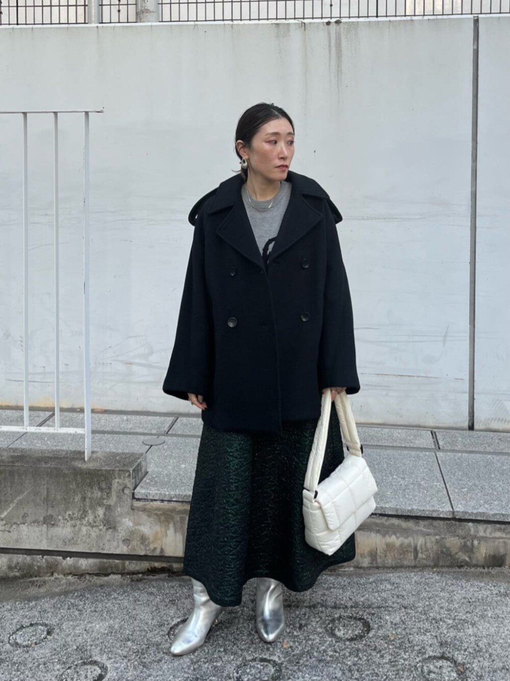 【サイズ感】 アウター:ゆったり トップス:標準 ボトムス:標準 【着用レビュー】 シャイニーなハリ感スカートをモードに着こなす♪ ゆるコート&ボリュームスカートにはシルバーブーツでピリッと引き締めて☆ インナーはロゴニットでカジュアルさをプラスしました!