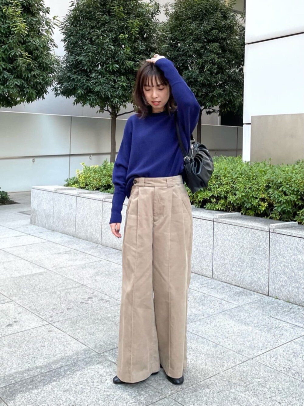 [サイズ感] トップス:ゆったり ボトムス:標準 [コーディネート] ドルマンニットにワイドパンツ合わせのゆるシルエットコーデも、ウエストをインして強調すれば好バランスに!
