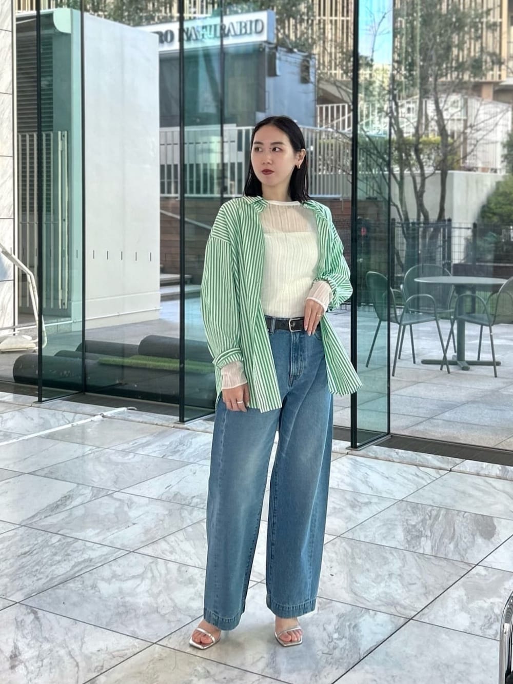 <サイズ感> シャツ:ゆったり インナーのニット:細身 パンツ:標準 カラー同士の合わせで春らしくまとめました! ブルーとグリーンは意外と喧嘩しづらい組み合わせです。 デニムを履くと少しカジュアルダウンしますが、 ヒールで女性らしくしてます☆ シャツは1枚で着るのも、羽織として着るのも、ニット下にレイヤードするのも◎!