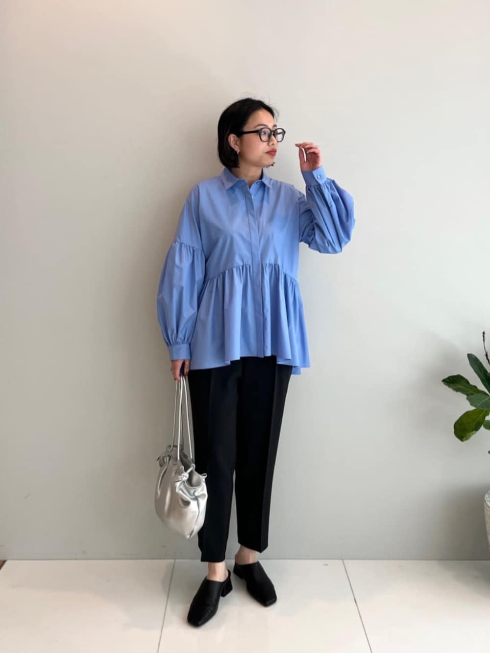 ペプラムブラウス×テーパードパンツでオフィスにもおすすめのキレイめコーデ! 【サイズ感】 ブラウス:ヒップが隠れるゆったりシルエット パンツ:ハイウエストで履いてくるぶし上くらいの着丈 【着用レビュー】 ブラウス:さらっと着られるシャツ素材で着心地◎ギャザー入りデザインで着映え効果も◎ パンツ:オンオフ使えるキレイめ素材。ウエスト部分が全てゴムなのでとてもラクチンです◎