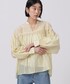 ハリ感のある素材のボリュームブラウスは 胸から袖にかけての大胆なギャザーデザインポイント! 程よい透け感とボリュームのある袖が大人っぽく華やかな雰囲気です。足元をスニーカーで、カジュアルスタイルにも◎