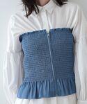 お出かけにもオフィスにも♪ビスチェを使ったキレイめカジュアルコーデ! 【サイズ感】 ビスチェ:身体にフィットしますが、シャーリングデザインでゴムが入っているので締め付け感なく着られます◎ ブラウス:ヒップが隠れる長め丈 パンツ:ハイウエストで履いてくるぶし上の着丈 【着用レビュー】 ビスチェ:360°シャーリングデザインでゴム入りなのでとてもラクチン◎ ブラウス:肌触りの良い柔らかい素材で着心地◎シアー感があるのでインナーは必須です。 パンツ:着脱もラクでさらっと履けます◎キレイ見えする素材なのでオフィススタイルにもおすすめです!