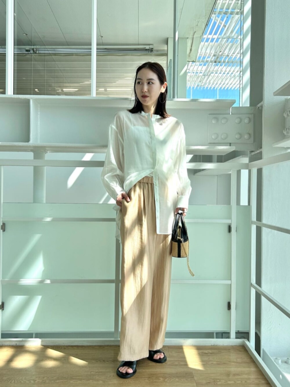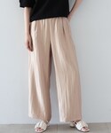<サイズ感> シャツ:ゆったりめ パンツ:標準(ウエスト総ゴム) 膨らみ感と光沢があるシアーシャツなので、 サラッと着れます! 夏は日除けなどにも使えそうです。 パンツも少し光沢あり、光に当たるときらっと綺麗に! 淡めトーンな女性らしいスタイリングです。