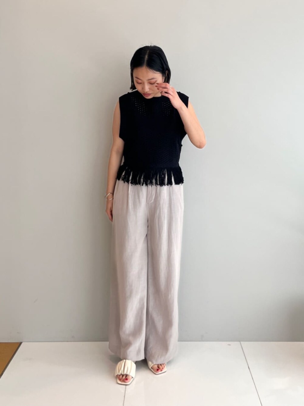 夏におすすめのフリンジニットを使った大人カジュアルコーデ! 【サイズ感】 ニット:着丈短めで、身幅に程よく余裕のあるシルエット パンツ:ハイウエストで履いてフルレングス 【着用レビュー】 ニット:毛羽立ちを抑え、チクチクもしないのでとても着やすく、レイヤードにもおすすめの1着◎着丈短めなのですっきり見えも◎ パンツ:さらっと履けるワイドパンツ。オンオフどちらにもおすすめです!