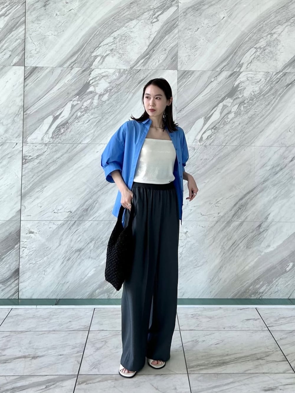 【サイズ感】 シャツ:ゆったり キャミソール:標準 パンツ:標準 【スタイリング】 ゆったりシャツを羽織りとして着用しています。 ハリのある素材で立体感ある袖もポイント。 肘が隠れるくらいの袖丈なので、夏の羽織りものとしてちょうどいいです! 大人気パンツは新色を加えて再入荷しました! グレーは前回のものより少し濃くなっております。 楽に履けて、履くだけでモードな雰囲気が出て、 使い勝手が最高です☆