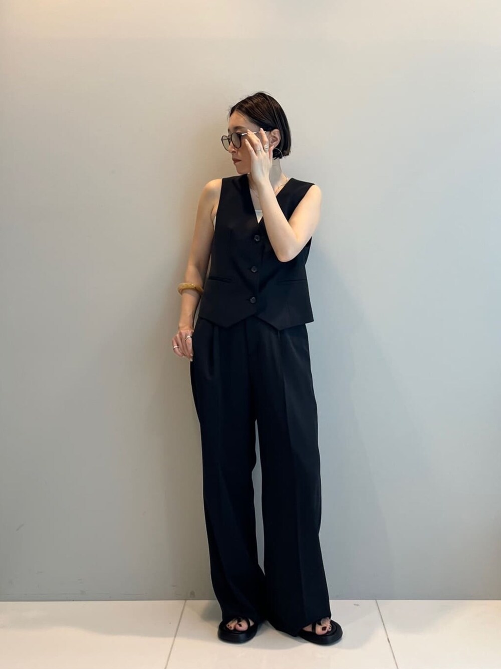 【サイズ感】 トップス:標準 ボトムス:標準 【着用レビュー】 マニッシュな装いのセットアップ♪ ベストはミニマムなサイズ感で新鮮! 一枚でトップスのように着るのもヘルシーでカッコいいですよ☆ パンツはウエスト調整ができるデザインなので、ご自身に合わせてお好みの穿き心地を選べます♪