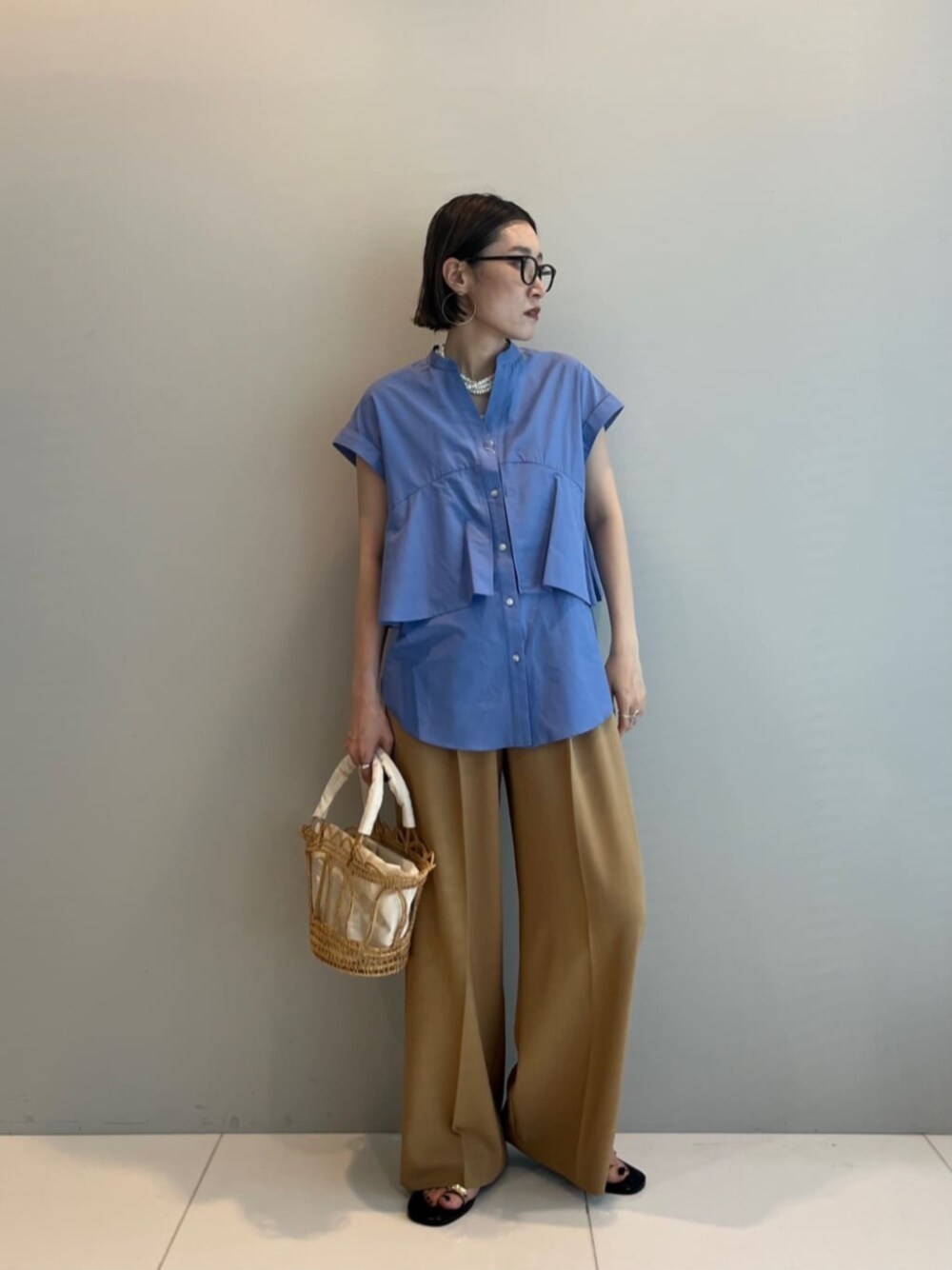 【サイズ感】 トップス:標準 ボトムス:標準〜ゆったり 【着用レビュー】 サラッとした肌あたりのシャツブラウス♪ ハリはあるのにしっとり感もあって、心地良く着られます。 裾のイン/アウトでアレンジできるのも魅力的☆ パンツはイロチ買いされる方続出の名品! サラッサラで落ち感があり、でも肉感を拾わないシルエットが秀逸です☆