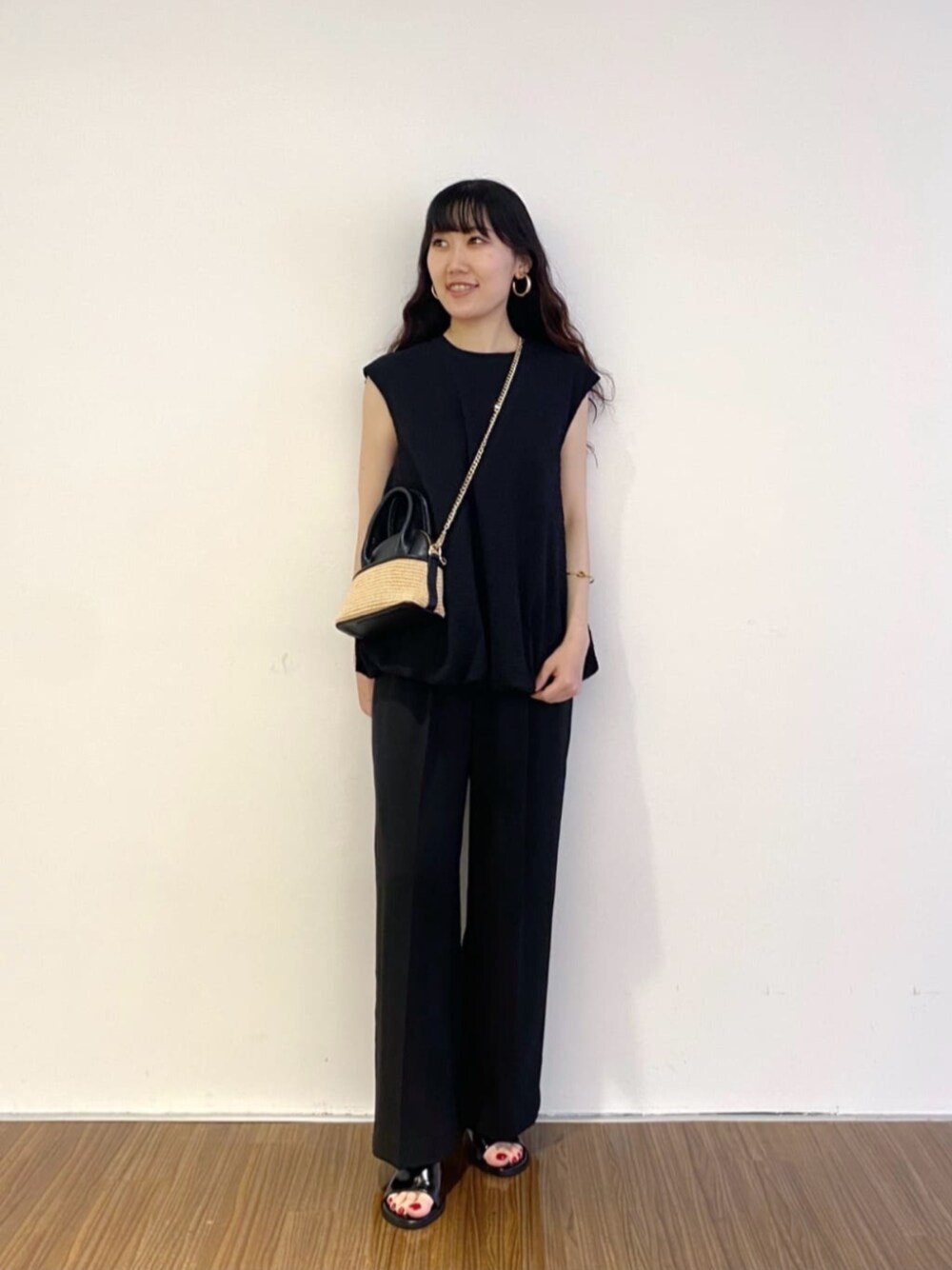 素材選びで涼しく♪/ オールブラックスタイル。 やっぱり安心感のある黒。 でも夏は重い?暑い?そんな方へオススメしたい黒アイテムです。 ○裾バルーンサッカーブラウス 肌離れの良いサッカー素材使用。 夏に持っておくと万能な素材です。 お袖はフレンチスリーブで華奢見え。 裾バルーンがポイントで、コーデのアクセントになってくれます♪ ○イージーストレートワイドパンツ 定番人気アイテム。穿いて驚く軽さ・楽さ♪ ご試着後は2枚買いやイロチ買いをしたくなるお客様多数! シルエットも綺麗で、オフィスから普段にまで着回せる万能パンツ。 スタッフからも大好評です♡ 夏のよく歩く日や旅行にぴったりな大人カジュアルコーデの完成!