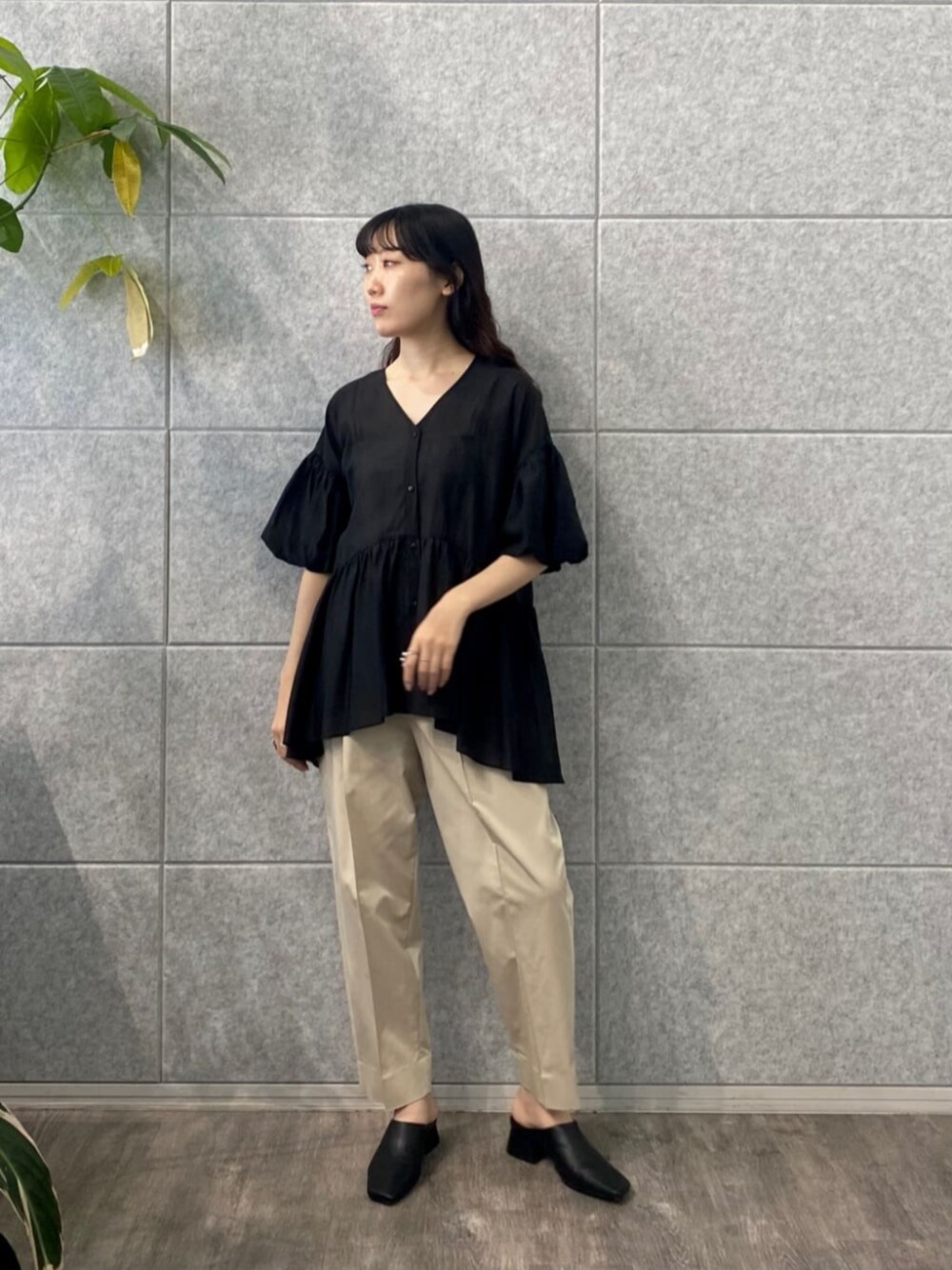 足元で雰囲気を変える/ 軽やか夏スタイル。 ○シアーペプラムブラウス 首元のすっきりしたアイテムです。 お袖は肩を落とした部分からボリュームがあるので、肩周りは華奢に見えるデザイン。 裾のペプラム切り替えで体型カバーもバッチリ! 羽織使いにも。 ○バレルクリースパンツ 今年トレンドのバレルシルエット。 腰回りにゆとりをもたせたラインで、すっきりとお召しいただけます。 センターのラインがあることで、足を真っ直ぐ魅せてくれます♪ 一見フェミニンなデザインのブラウスは黒を選ぶと、シックな雰囲気に。足元で雰囲気を変える/ 軽やか夏スタイル。 ○シアーペプラムブラウス 首元のすっきりしたアイテムです。 お袖は肩を落とした部分からボリュームがあるので、肩周りは華奢に見えるデザイン。 裾のペプラム切り替えで体型カバーもバッチリ! 羽織使いにも。 ○バレルクリースパンツ 今年トレンドのバレルシルエット。 腰回りにゆとりをもたせたラインで、すっきりとお召しいただけます。 センターのラインがあることで、足を真っ直ぐ魅せてくれます♪ 一見フェミニンなデザインのブラウスは黒を選ぶと、シックな雰囲気に。