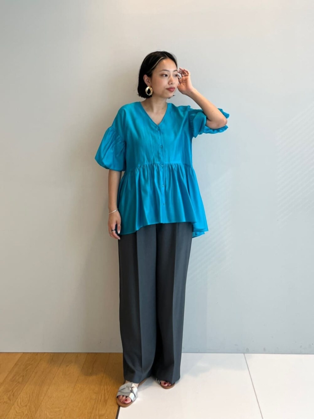 オンオフ兼用◎カラーブラウスとワイドパンツを使ったキレイめカジュアルコーデ 【サイズ感】 ブラウス:身幅にゆとりがあり、腰回りをしっかりカバーしてくれます◎ パンツ:ハイウエストで履いてフルレングス。着丈長めなので高身長さんにもおすすめです! 【着用レビュー】 ブラウス:程よくシアー感があり、暑い夏でもさらっと着られる素材です!ペプラムとバルーンシルエットがポイントで、トレンド感たっぷりなコーデを楽しめます♪Vネックなのですっきり見え、羽織りとしても◎ パンツ:ウエストゴムで、ラクチンさときちんとさを叶えるイージーパンツです! 上下どちらもオンオフ兼用で、夏でもさらっと着られます!