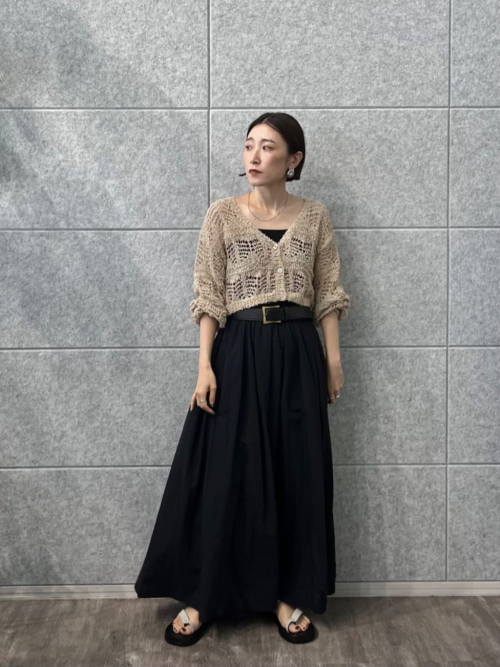 【サイズ感】 トップス:標準 ボトムス:標準 【着用レビュー】 袖が長めの透けニットカーディガン♪ コンパクトな丈感とのコントラストが今っぽくてオシャレです☆ スカートはナイロン素材ですが、着ると意外と涼しい! シワや汚れも気にせず、雨の日も着やすそうです♪