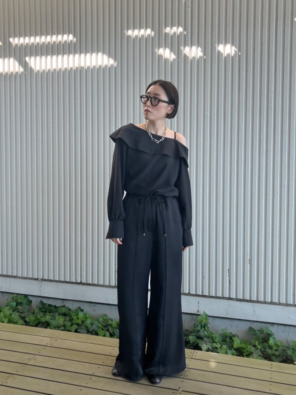 【サイズ感】 トップス:標準 ボトムス:ゆったり 【着用レビュー】 かっこいい大人のオンナコーデ! 薄手ですがハリ感があり、ふわっとするブラウス♪ トレンドのオフショルダーをモードに楽しんでいただけます! パンツは柔らかなゆるっとしたシルエット。 テロテロした素材です。 ウエストはゆるいですが、紐で調整できます☆ 丈がけっこう長めでした!