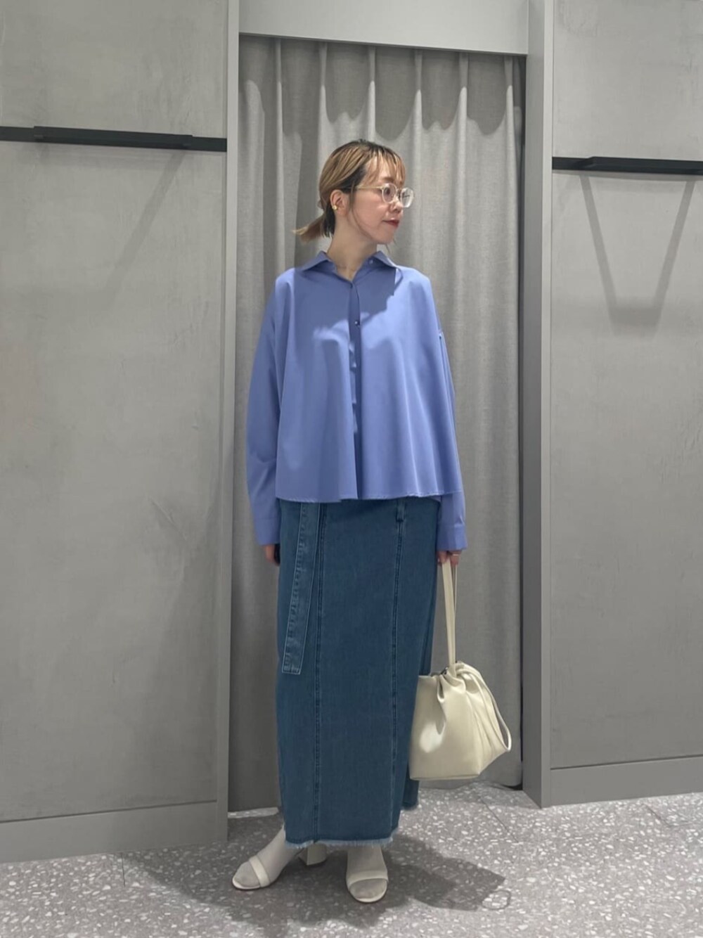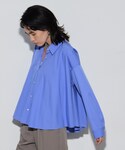 【デザインシャツスタイル】 フレアなシルエットがとってもかわいいブラウスをデニムスカートでカジュアルに合わせました。 着丈のスッキリしたブラウスなのでスカートともバランス◎ ブルー✖️ホワイトでカジュアルフェミニンな雰囲気に。 足元はスニーカーもいいですが、サンダルにソックスでワンランクアップのおしゃれスタイルに♪ ♢ブラウス Aラインのシルエットがかわいい。 後ろ下がりのシルエットで体型カバーも◎ シャツカラーなので甘すぎず、お仕事にも使いやすいブラウスです。 ♢スカート スッキリIラインのスカート。タイトすぎず、柔らかい生地なのでとっても履きやすい! 長めなベルトがアクセントに。