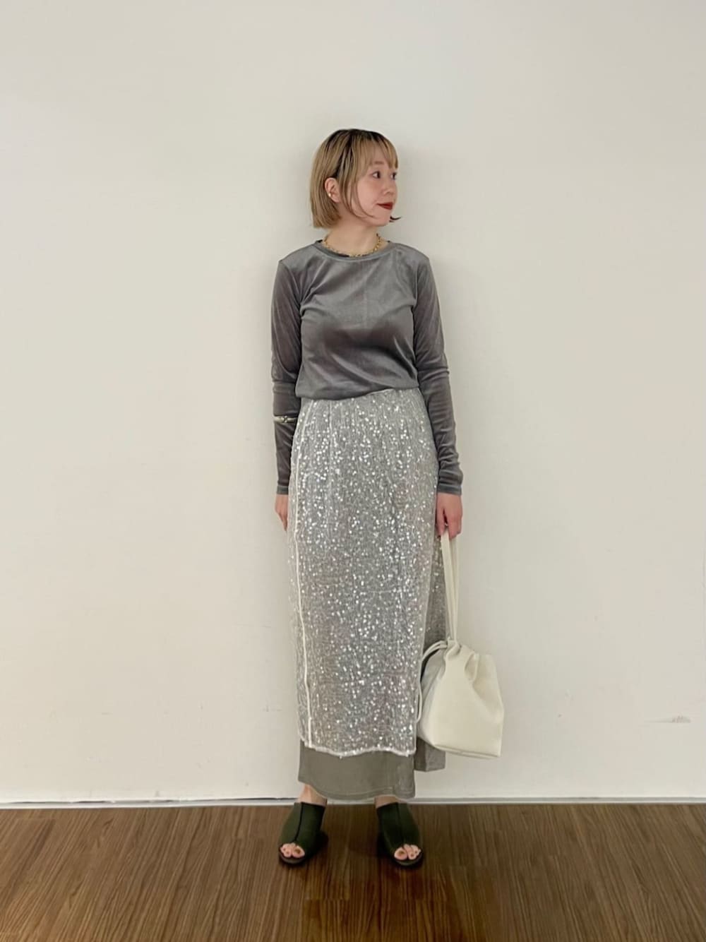【シアーなグレイッシュコーデ】 ベロア素材やキラキラスパンコールなど華やかな素材感のスタイルですが、グレーのワントーンで合わせることで派手すぎず、おしゃれな雰囲気に♡ ♢トップス ベロア✖️シアーの今年らしいトップスです。 襟が詰まっているので、カジュアルな雰囲気にも◎ ほどよく身体にフィットするコンパクトな作りなので、レイヤードのインナーにも使いやすいです。 ♢スカート ベロア素材とシアーなスパンコール素材と二枚セットのスカートです。 二枚重ねて履いてもいいですし、一枚ずつでも使えて着回し抜群♪ スパンコールのキラキラがコーディネートの主役に♡ トップスはシンプルなデザインのものがオススメです。 ♢サンダル 低めなヒールでとっても履きやすいサンダルです。 甲が隠れるデザインなので、夏から秋にかけてオススメ。 抹茶のようなカーキのカラーがオシャレな足元に◎