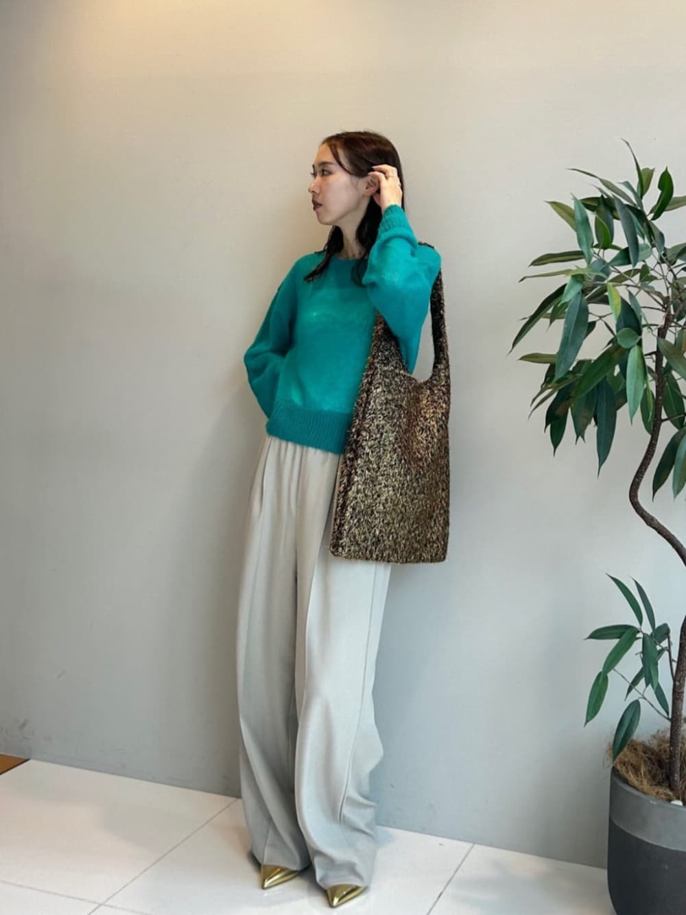【サイズ感】 ニット:標準 パンツ:標準 【スタイリング】 カラーが綺麗です! 着心地も柔らかく、ふわっと着れます。 目が荒めなのでカットソーやシャツをレイヤードして着るのもオススメです。