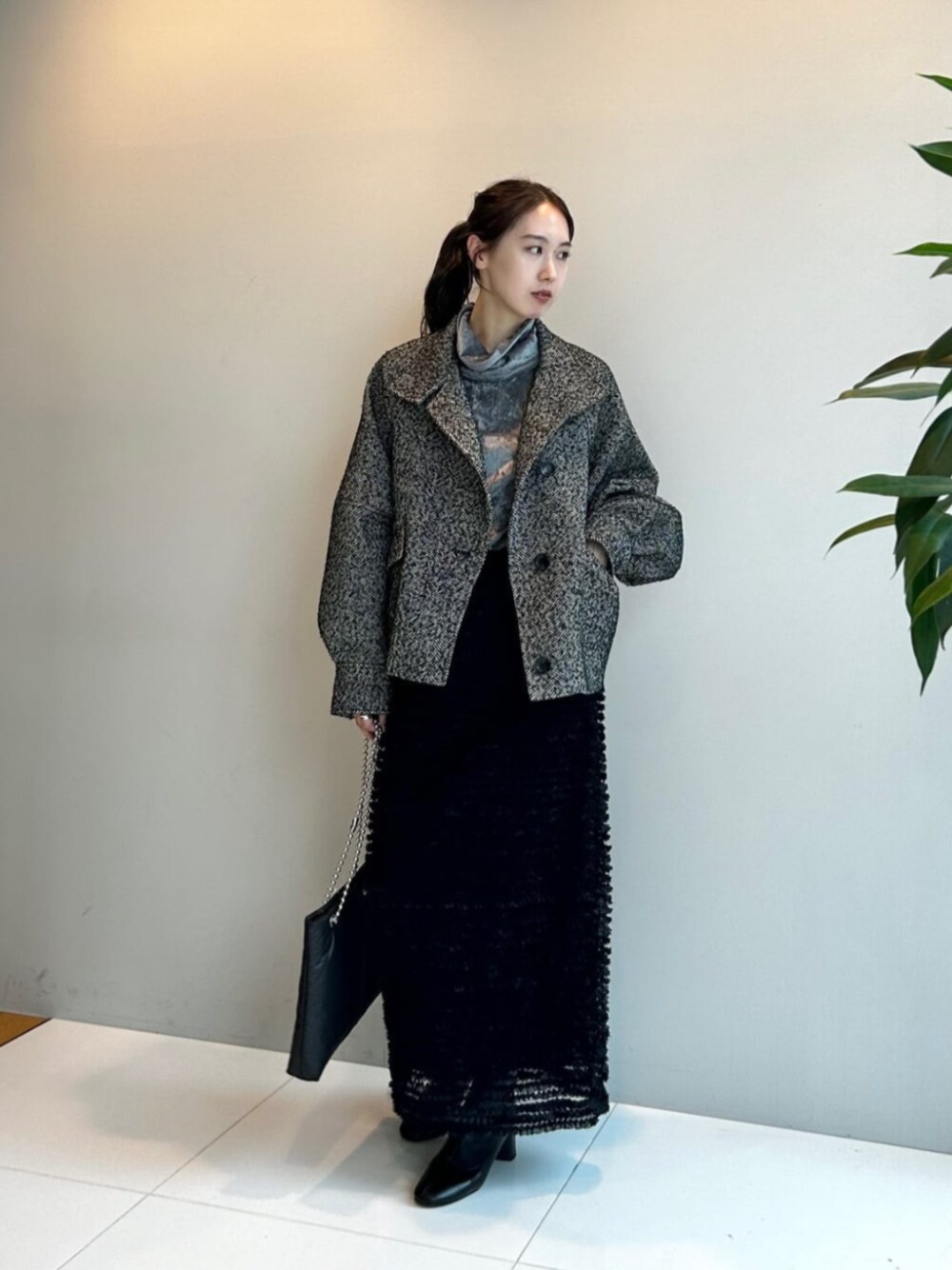 【サイズ感】 コート:ゆったりめ トップス:標準 スカート:標準 【スタイリング】 コートはどんなものでも合わせやすい形です!スカートはもちろんワイドパンツと合わせるスタイリングもおすすめです☆ 羽織るだけでレトロにかっこよく仕上がるコートです◎ ワントーンですが素材で遊んだスタイリングにしてみました!